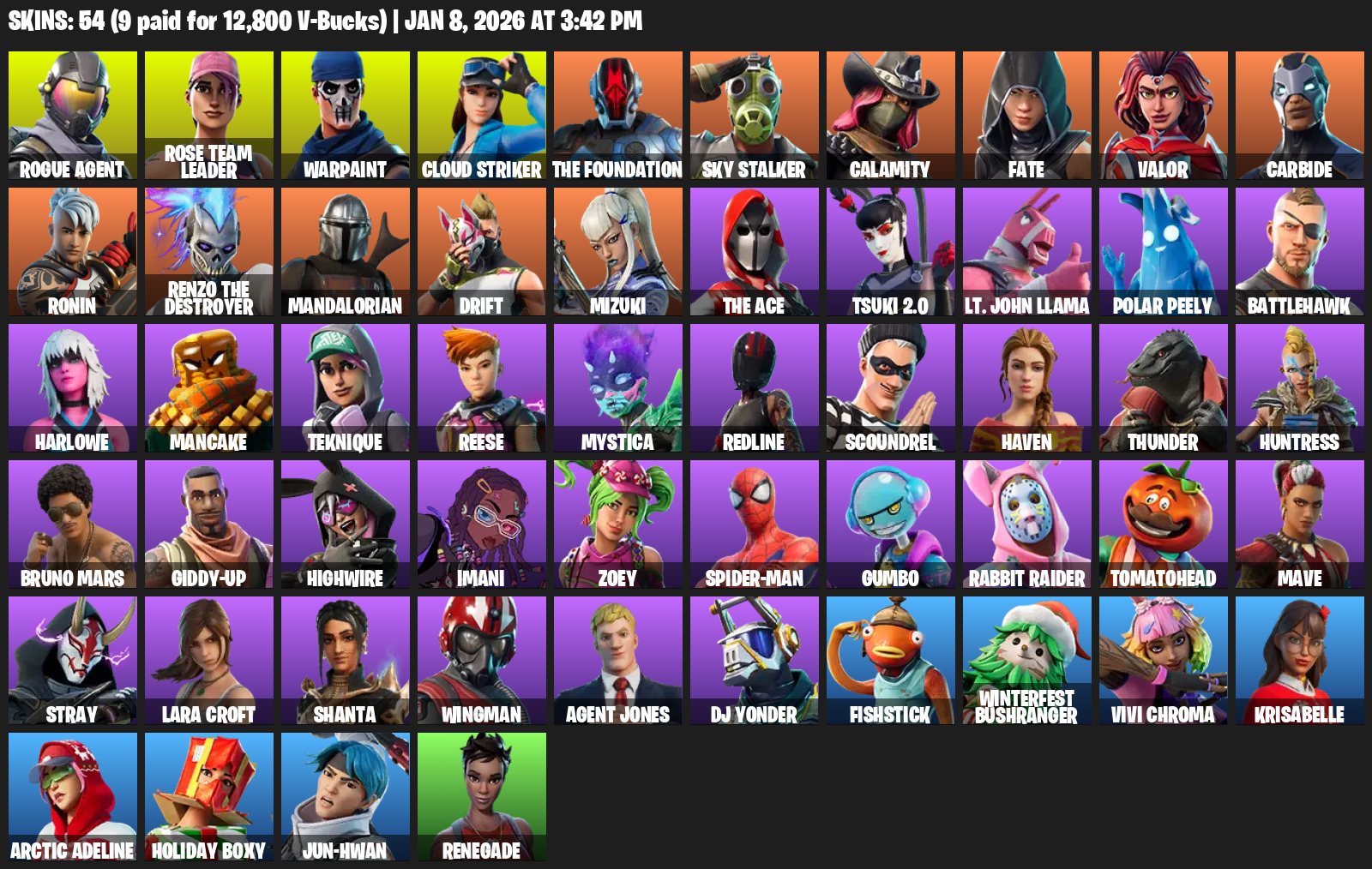 Lara Croft, Rogue Agent, Rose Team Leader, Warpaint, Cloud Striker, The Foundation, Sky Stalker, Calamity, Fate, Valor, Carbide, Ronin, Mandalorian, Drift, Mizuki, Tsuki 2.0, Lt. John Llama, Polar Peely