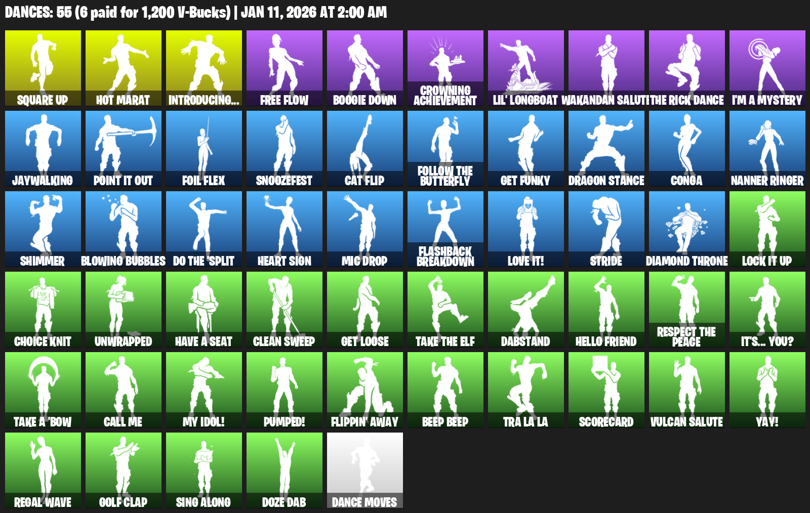 Hot Marat, Introducing…, Square Up, Free Flow, Boogie Down, Crowning Achievement, Lil’ Longboat, Wakandan Salute, I’m a Mystery, Jaywalking, Snoozefest, Cat Flip, Get Funky, Dragon Stance, Conga, Nanner Ringer