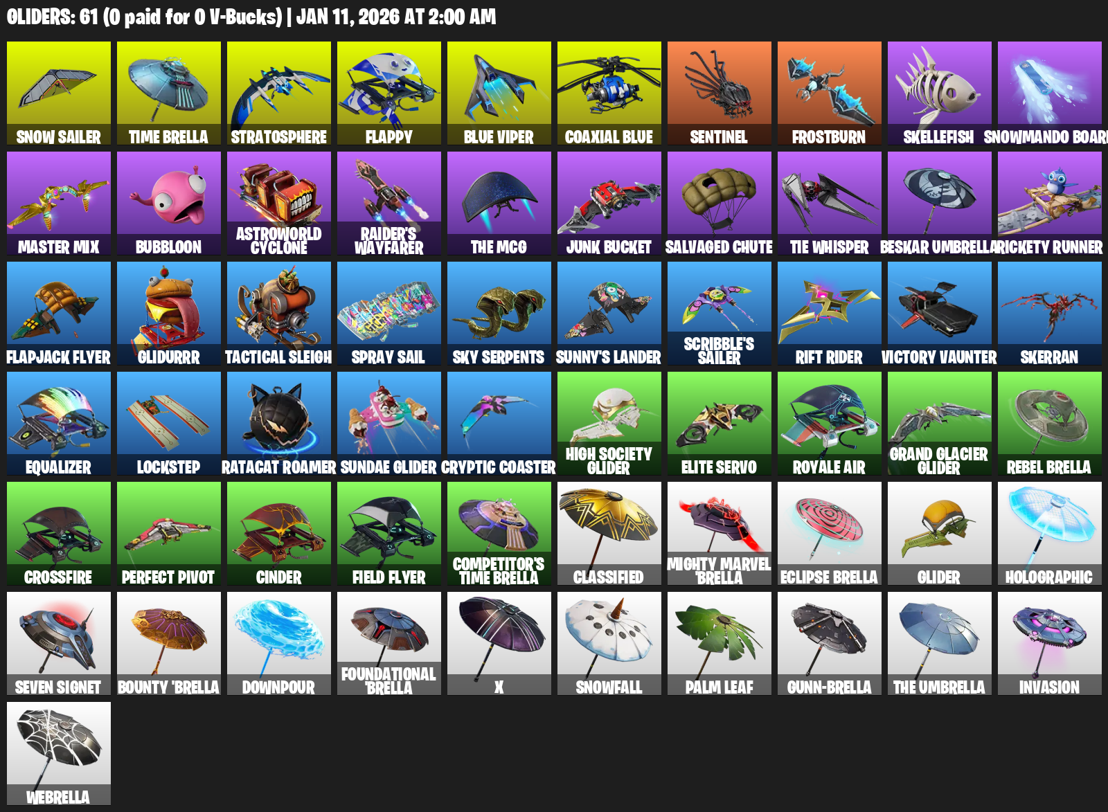 Snow Sailer, Time Brella, Stratosphere, Flappy, Blue Viper, Sentinel, Frostburn, Skellefish, Snowmando Board, Master Mix, Bubbloon, Astroworld Cyclone, Raider’s Wayfarer, Junk Bucket, Salvaged Chute, TIE Whisper, Beskar Umbrella, Rickety Runner