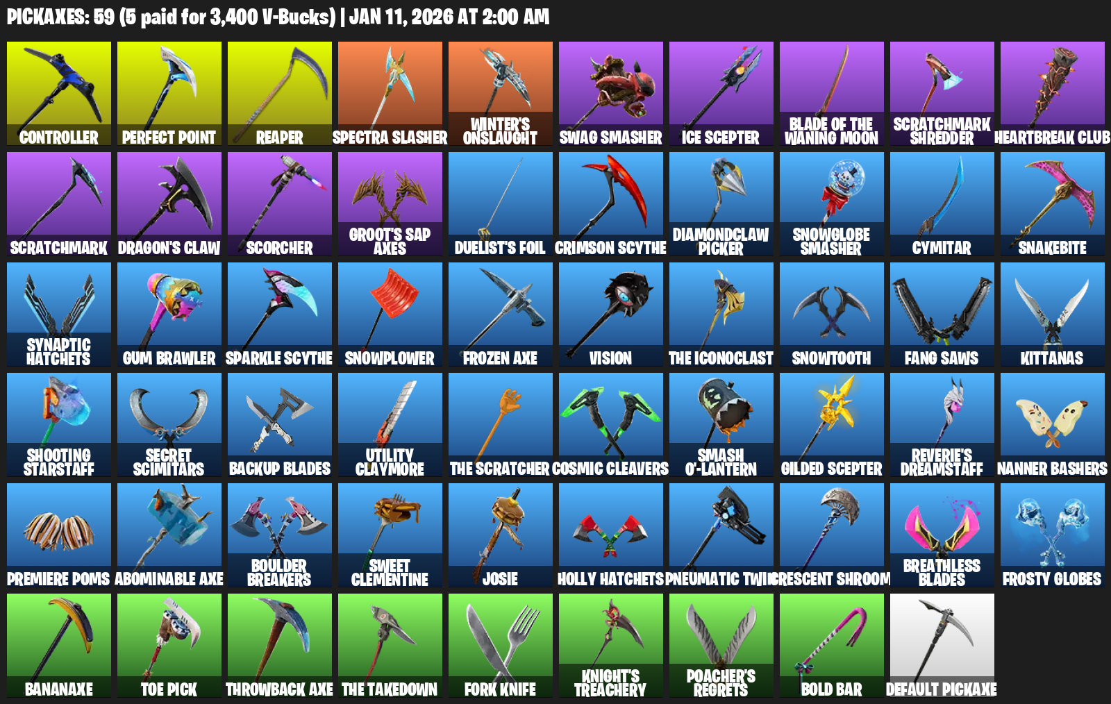 Controller, Reaper, Winter’s Onslaught, Swag Smasher, Ice Scepter, Scratchmark Shredder, Heartbreak Club, Dragon’s Claw, Scorcher, Groot’s Sap Axes, Duelist’s Foil, Crimson Scythe, Diamondclaw Picker, Cymitar, Snakebite