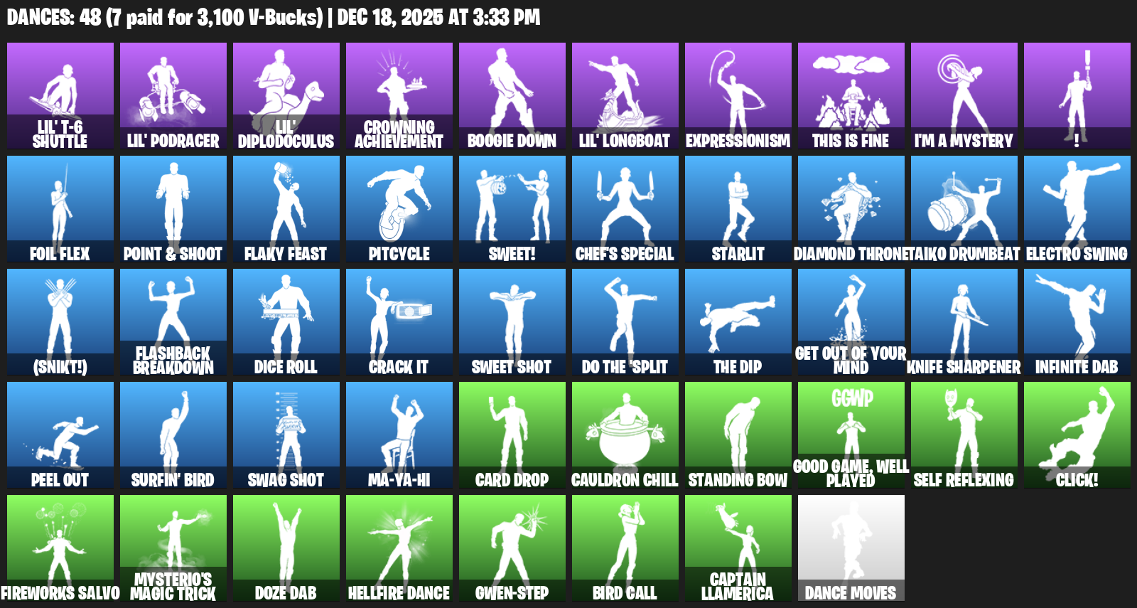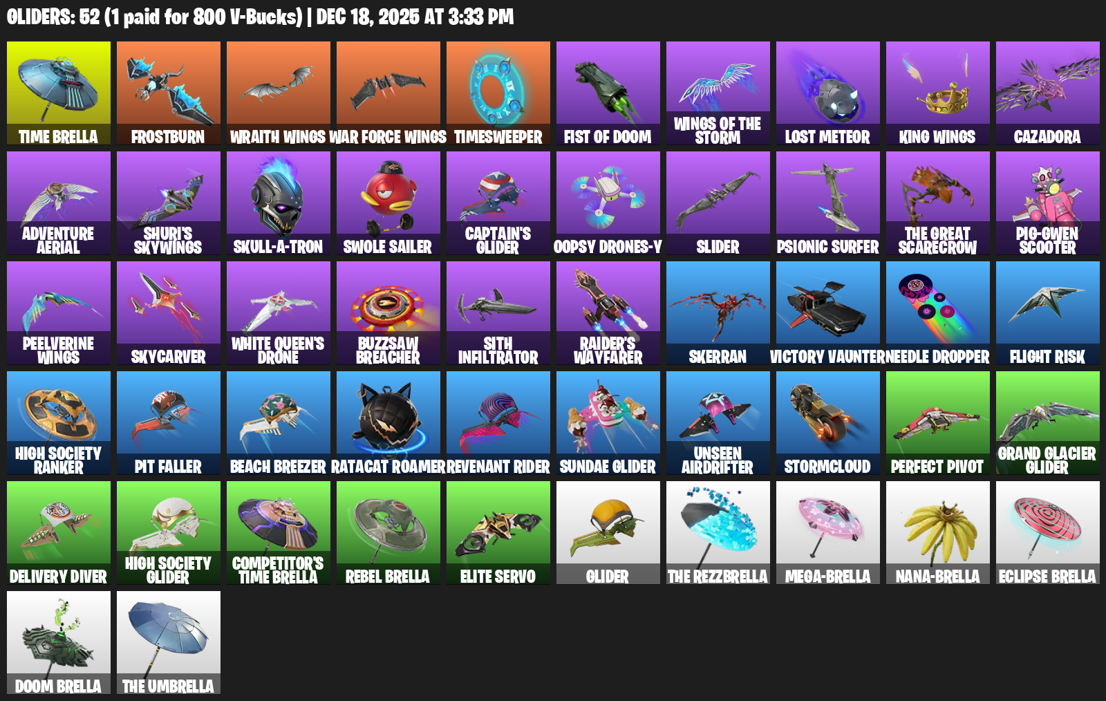 Time Brella, Frostburn, Wraith Wings, Timesweeper, Fist of Doom, Lost Meteor, Cazadora, Adventure Aerial, Shuri’s Skywings, Swole Sailer, Captain’s Glider, Oopsy Drones-y, Slider, Psionic Surfer, Pig-Gwen Scooter