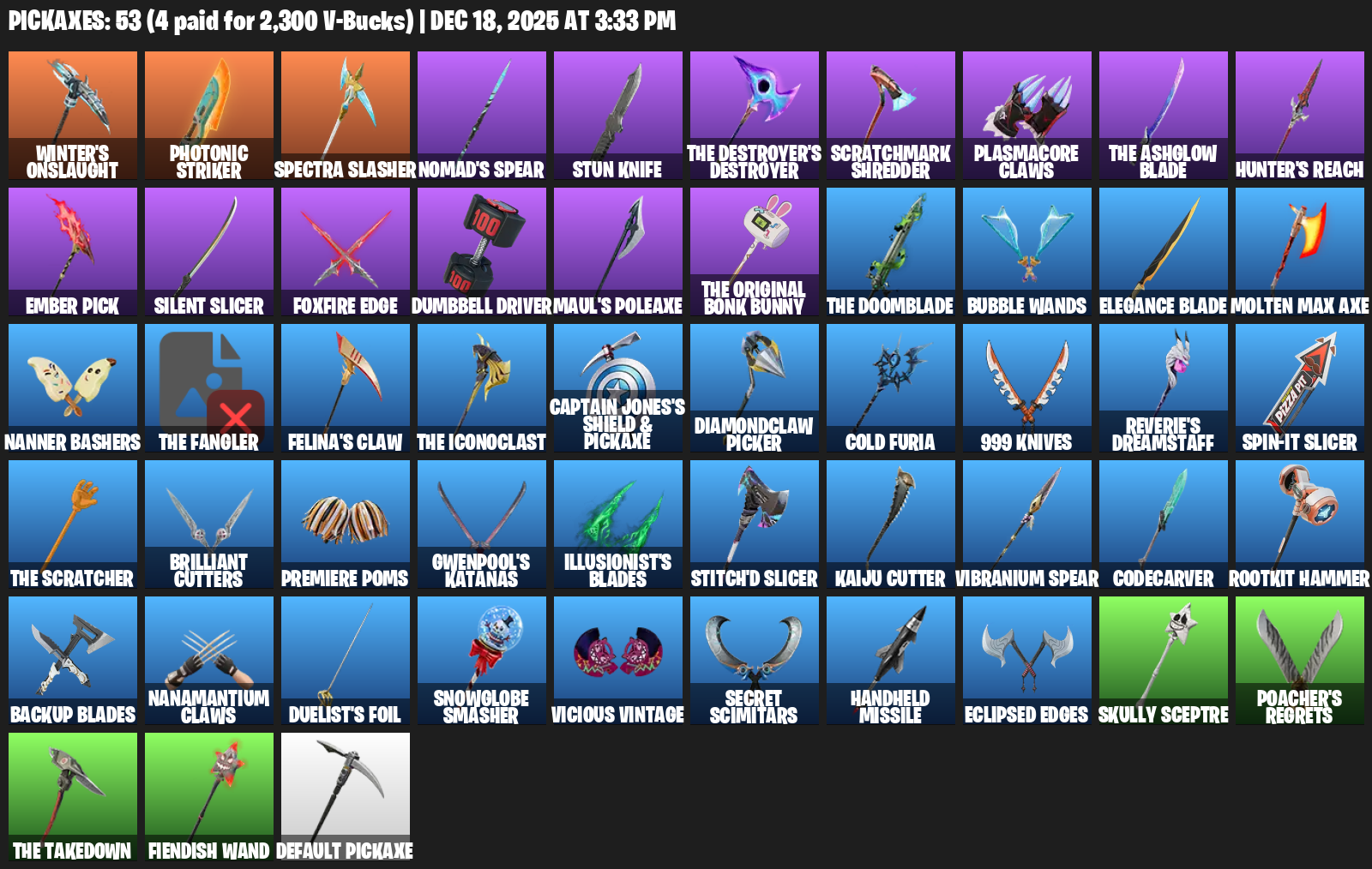 Winter’s Onslaught, Photonic Striker, Nomad’s Spear, Stun Knife, Scratchmark Shredder, Plasmacore Claws, Hunter’s Reach, Ember Pick, Silent Slicer, Foxfire Edge, Dumbbell Driver, Maul’s Poleaxe, Bubble Wands, Elegance Blade, Molten Max Axe