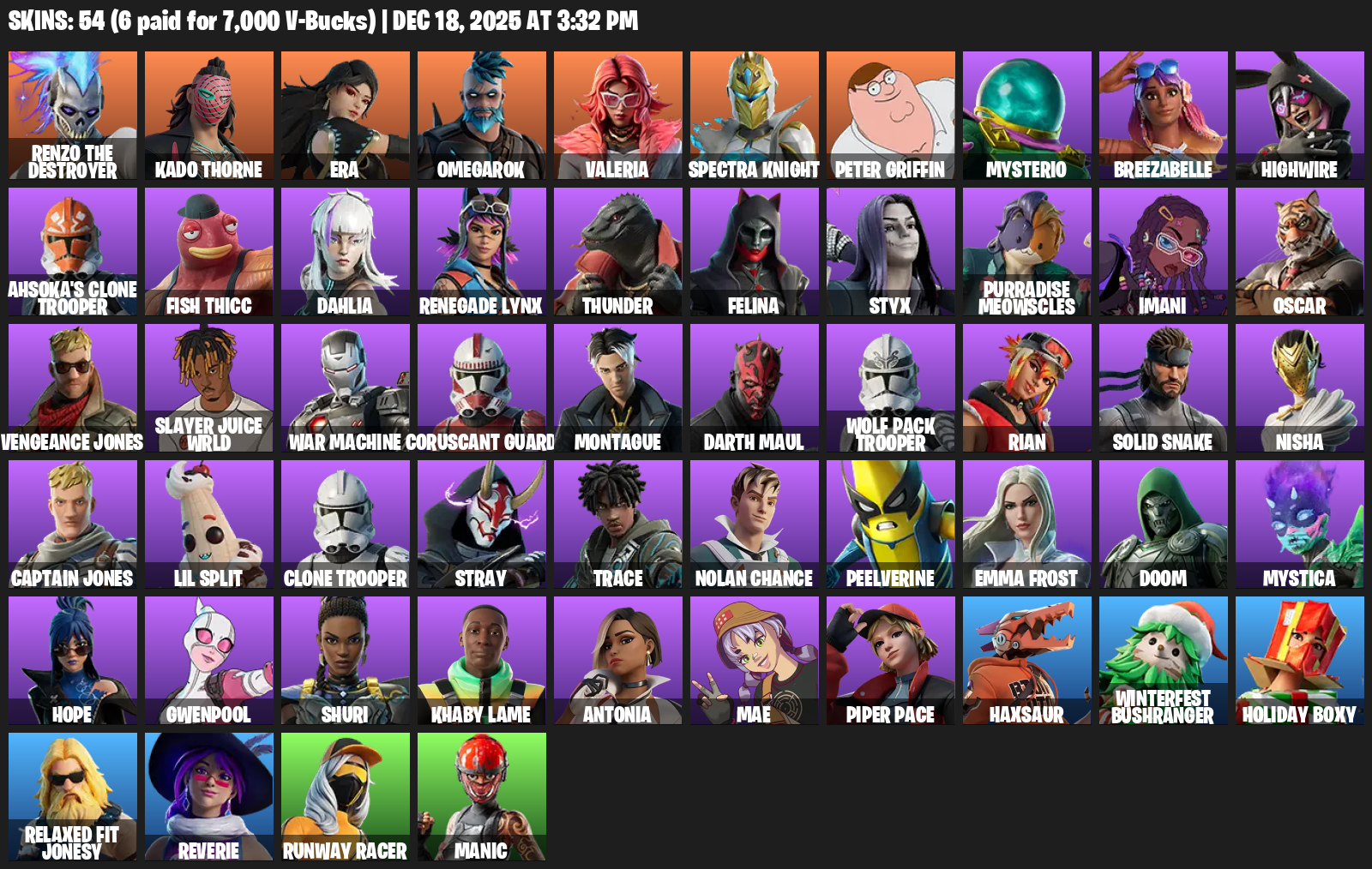 Renzo the Destroyer, Kado Thorne, Era, Omegarok, Valeria, Spectra Knight, Peter Griffin, Mysterio, Breezabelle, Highwire, Ahsoka’s Clone Trooper, Fish Thicc, Dahlia, Renegade Lynx, Thunder, Felina, Styx, Purradise Meowscles, Imani, Oscar