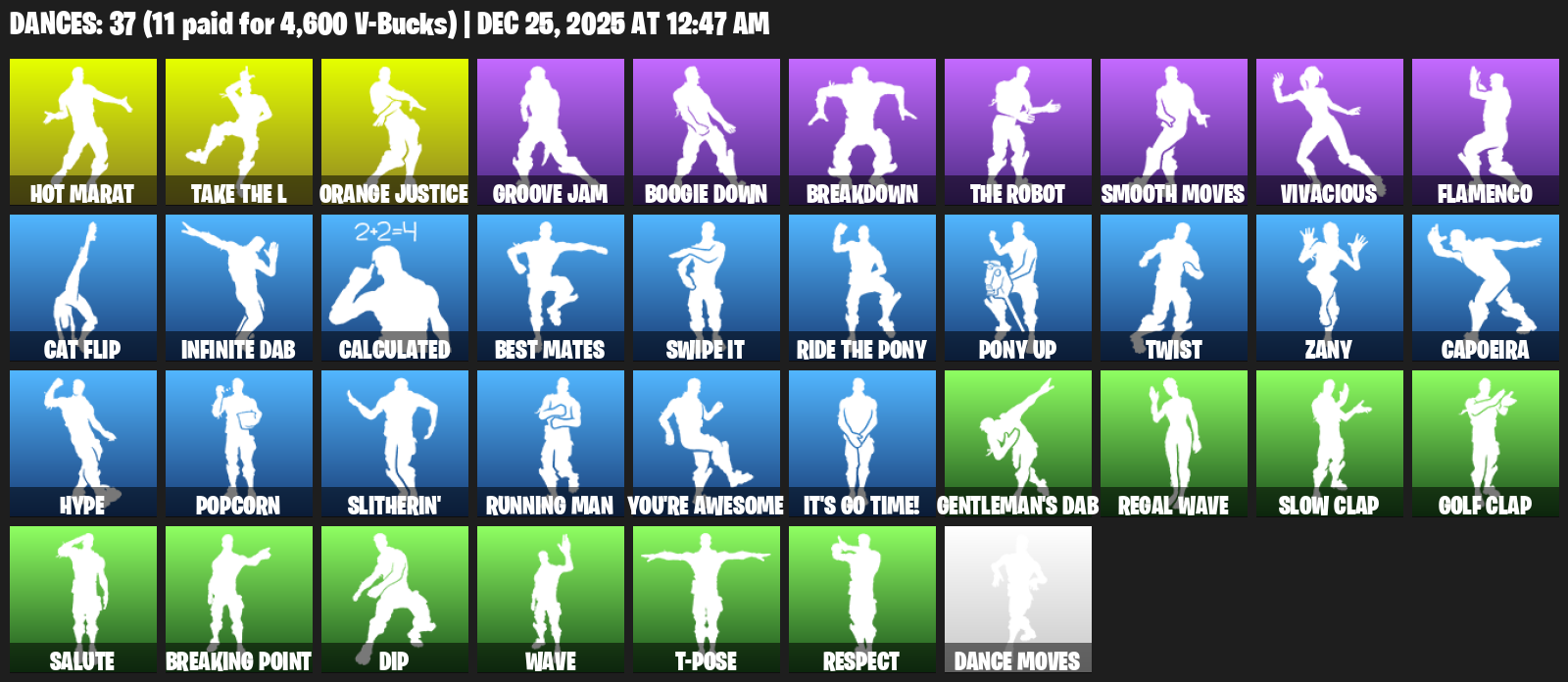 Hot Marat, Orange Justice, Groove Jam, Boogie Down, Breakdown, Smooth Moves, Vivacious, Flamenco, Cat Flip, Infinite Dab, Calculated, Best Mates, Swipe It, Twist, Zany, Capoeira