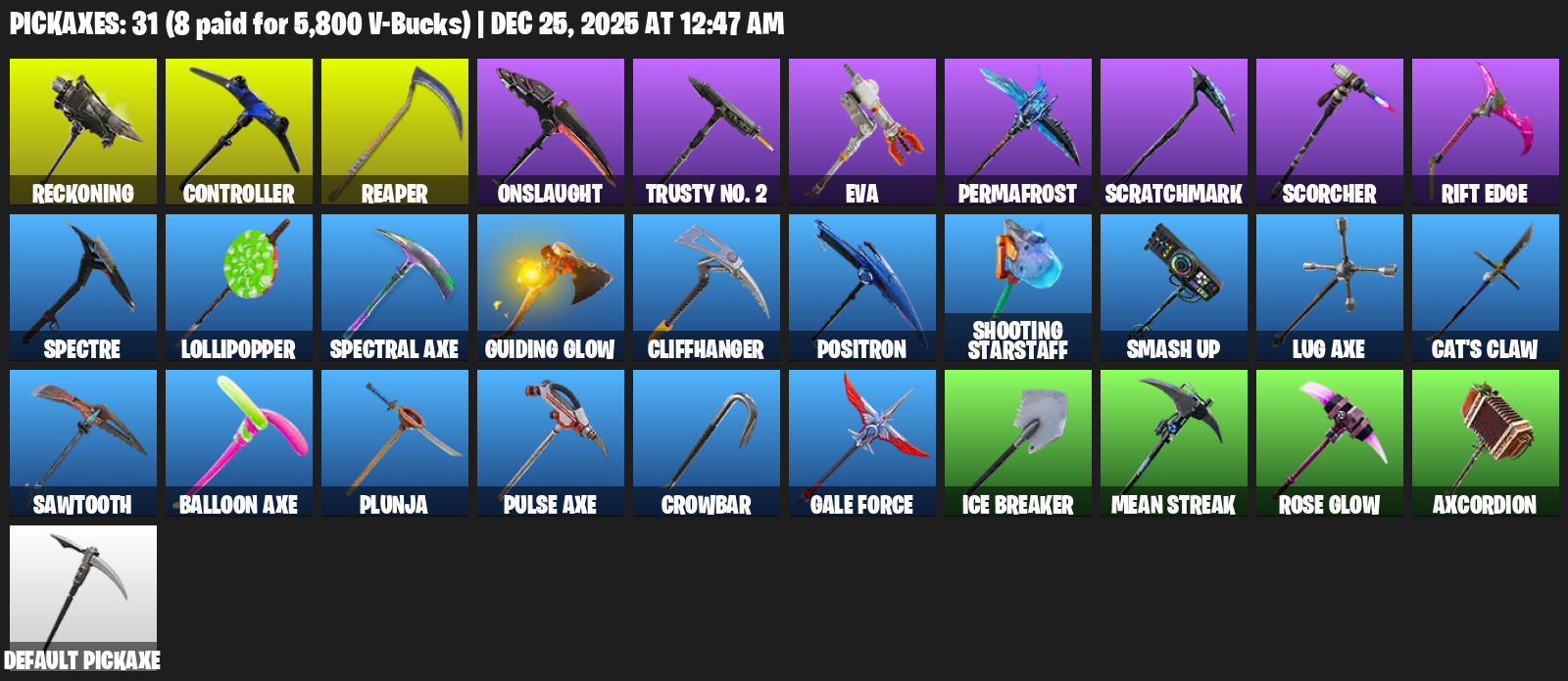 Reckoning, Controller, Onslaught, Trusty No. 2, EVA, Permafrost, Scratchmark, Scorcher, Rift Edge, Spectre, Lollipopper, Spectral Axe, Guiding Glow, Cliffhanger, Positron, Shooting Starstaff, Smash Up, Cat’s Claw