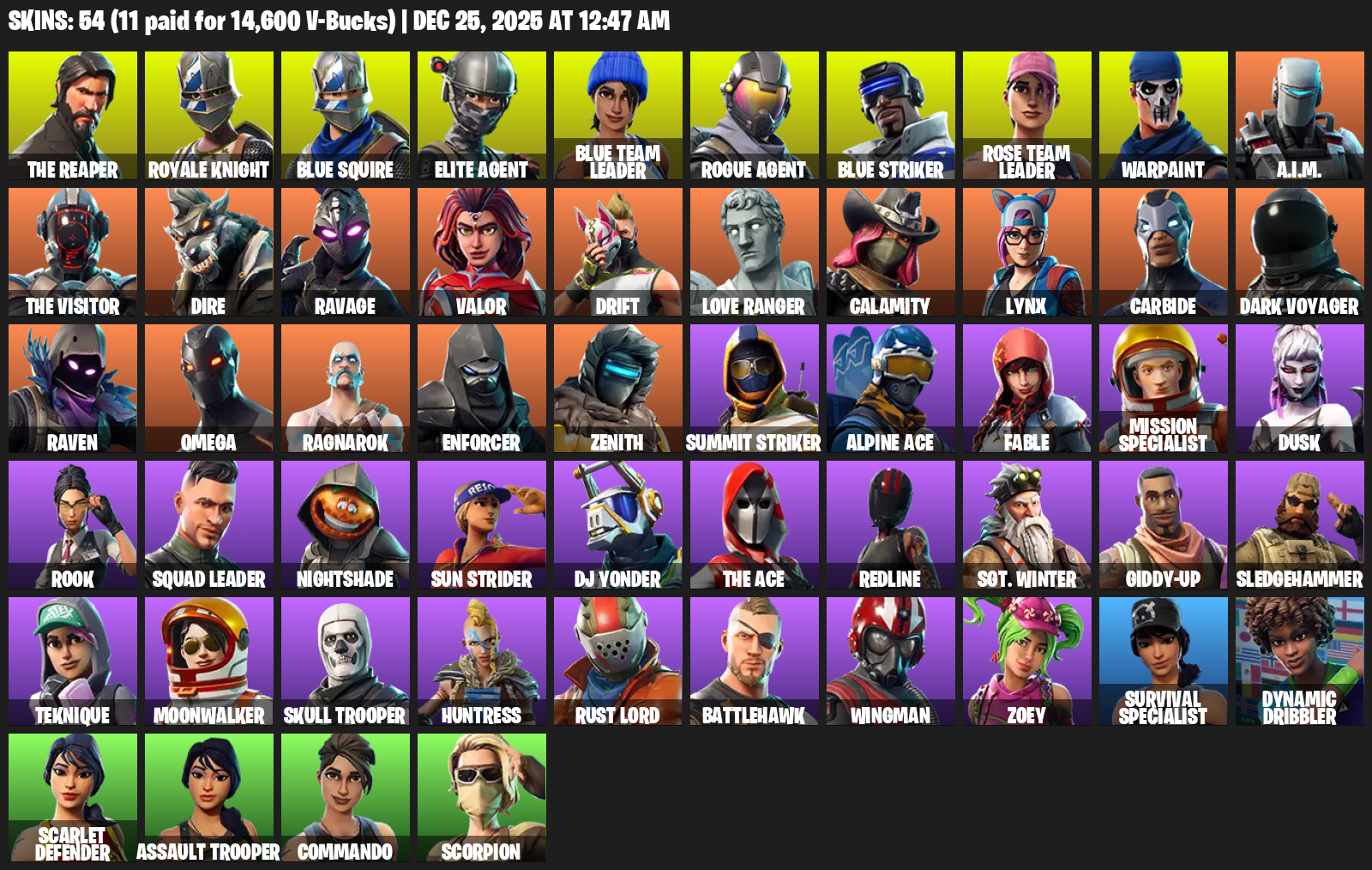 The Reaper, Royale Knight, Blue Squire, Elite Agent, Omega, Rose Team Leader, Warpaint, A.I.M., Dire, Ravage, Valor, Drift, Love Ranger, Calamity, Lynx, Carbide