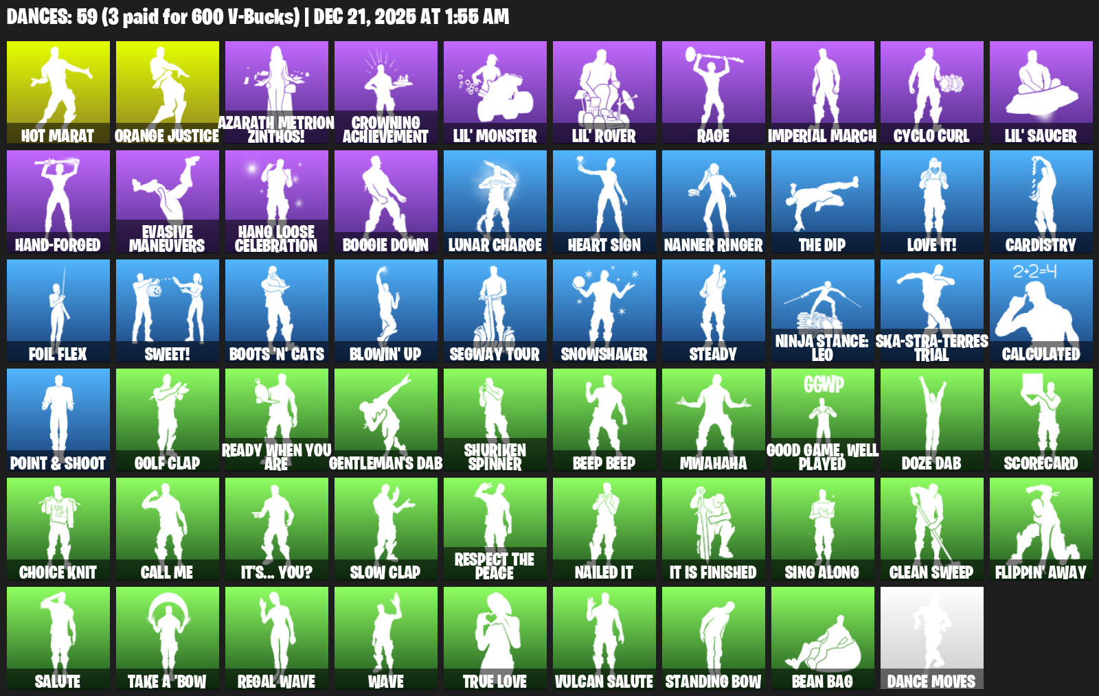 Hot Marat, Orange Justice, Azarath Metrion Zinthos!, Crowning Achievement, Lil’ Monster, Rage, Imperial March, Cyclo Curl, Hand-Forged, Evasive Maneuvers, Hang Loose Celebration, Boogie Down, Lunar Charge, Heart Sign, Nanner Ringer, Love it!, Cardistry