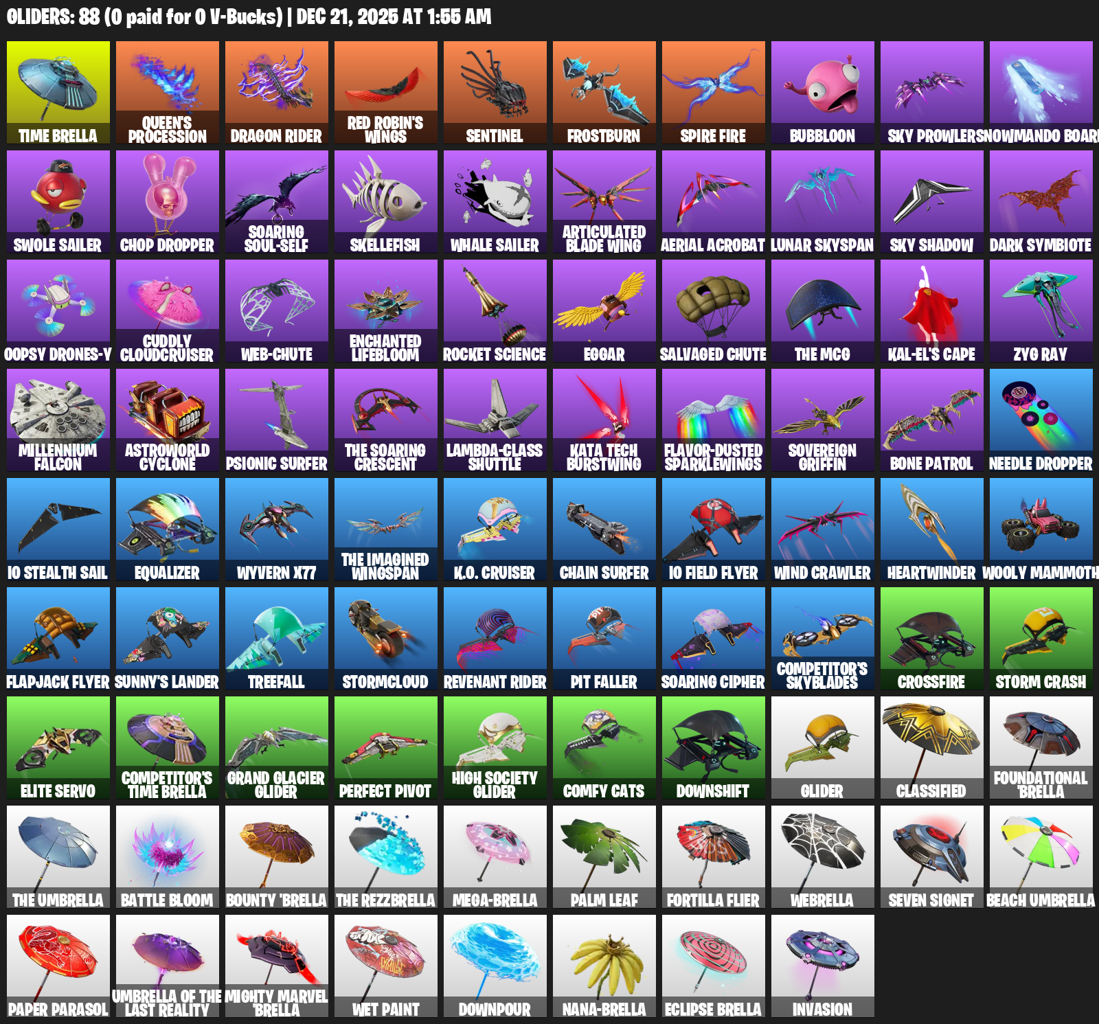 Time Brella, Queen’s Procession, Dragon Rider, Red Robin’s Wings, Sentinel, Frostburn, Bubbloon, Sky Prowler, Snowmando Board, Swole Sailer, Chop Dropper, Soaring Soul-Self, Skellefish, Aerial Acrobat, Dark Symbiote