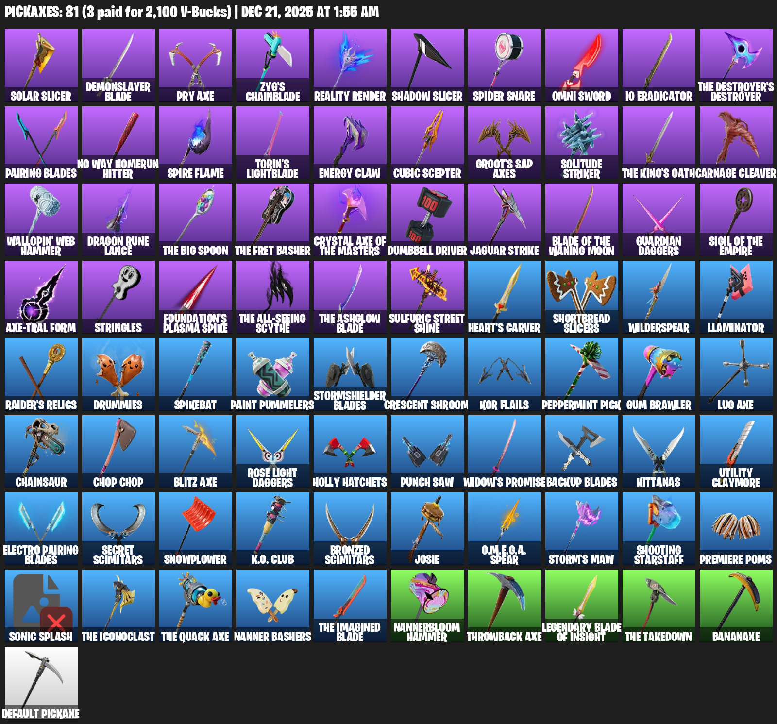 Solar Slicer, Demonslayer Blade, Pry Axe, Zyg’s Chainblade, Reality Render, Spider Snare, Omni Sword, IO Eradicator, Pairing Blades, No Way Homerun Hitter, Torin’s Lightblade, Energy Claw, Cubic Scepter, Groot’s Sap Axes, Solitude Striker, Carnage Cleaver