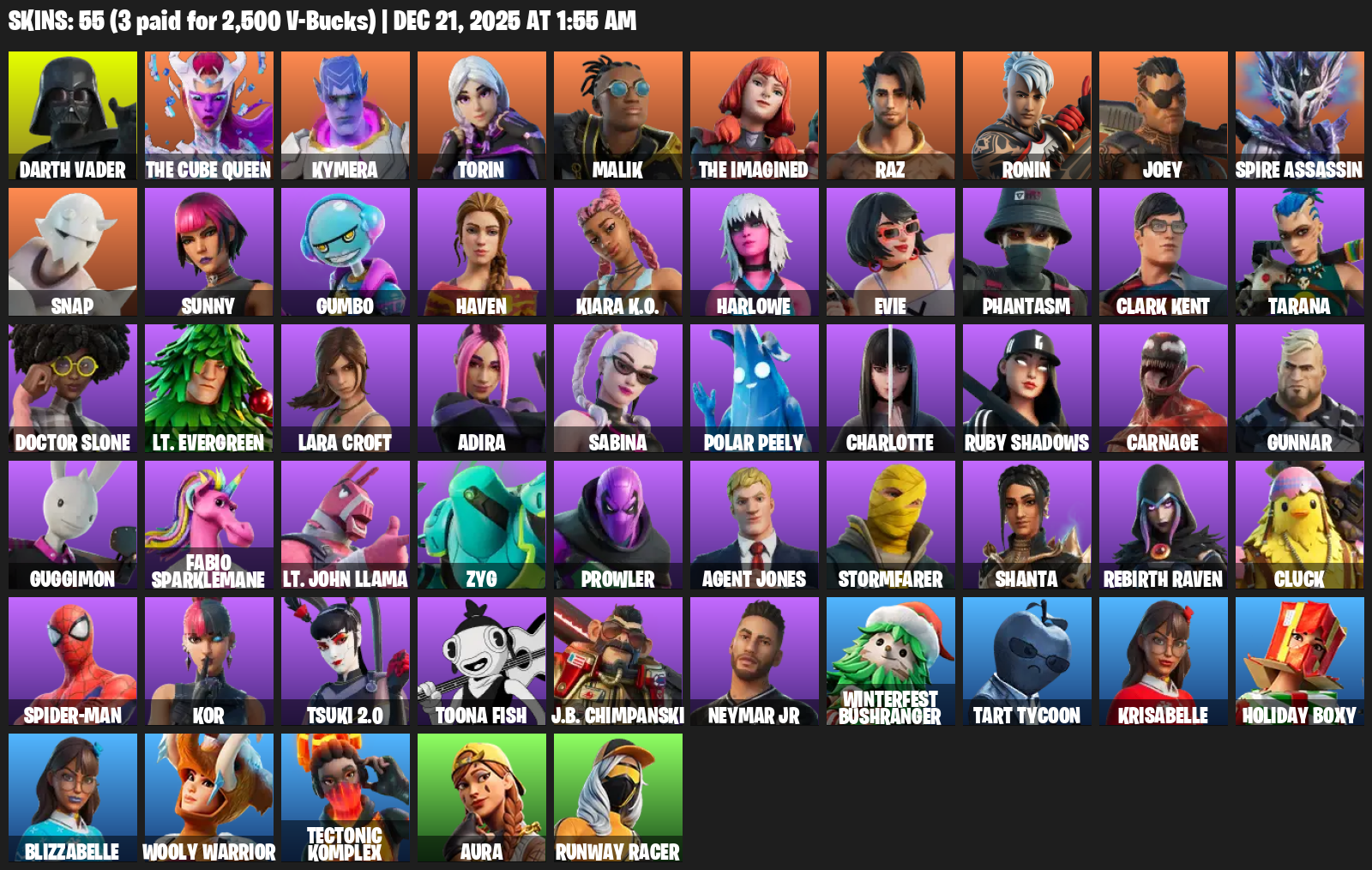 Lara Croft, Darth Vader, The Cube Queen, Kymera, Torin, Malik, Raz, Ronin, Joey, Spire Assassin, Snap, Sunny, Gumbo, Haven, Kiara K.O., Harlowe, Evie, Phantasm, Clark Kent