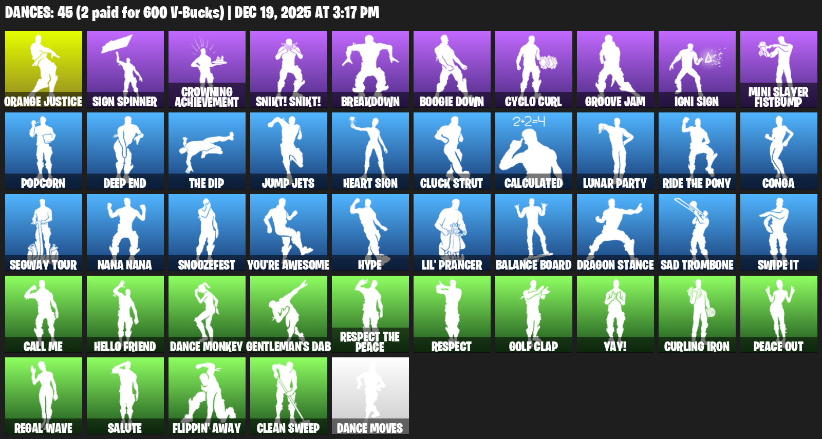 Orange Justice, Sign Spinner, Crowning Achievement, Snikt! Snikt!, Breakdown, Boogie Down, Cyclo Curl, Groove Jam, Mini Slayer Fistbump, Popcorn, Deep End, Jump Jets, Cluck Strut, Calculated, Lunar Party, Conga