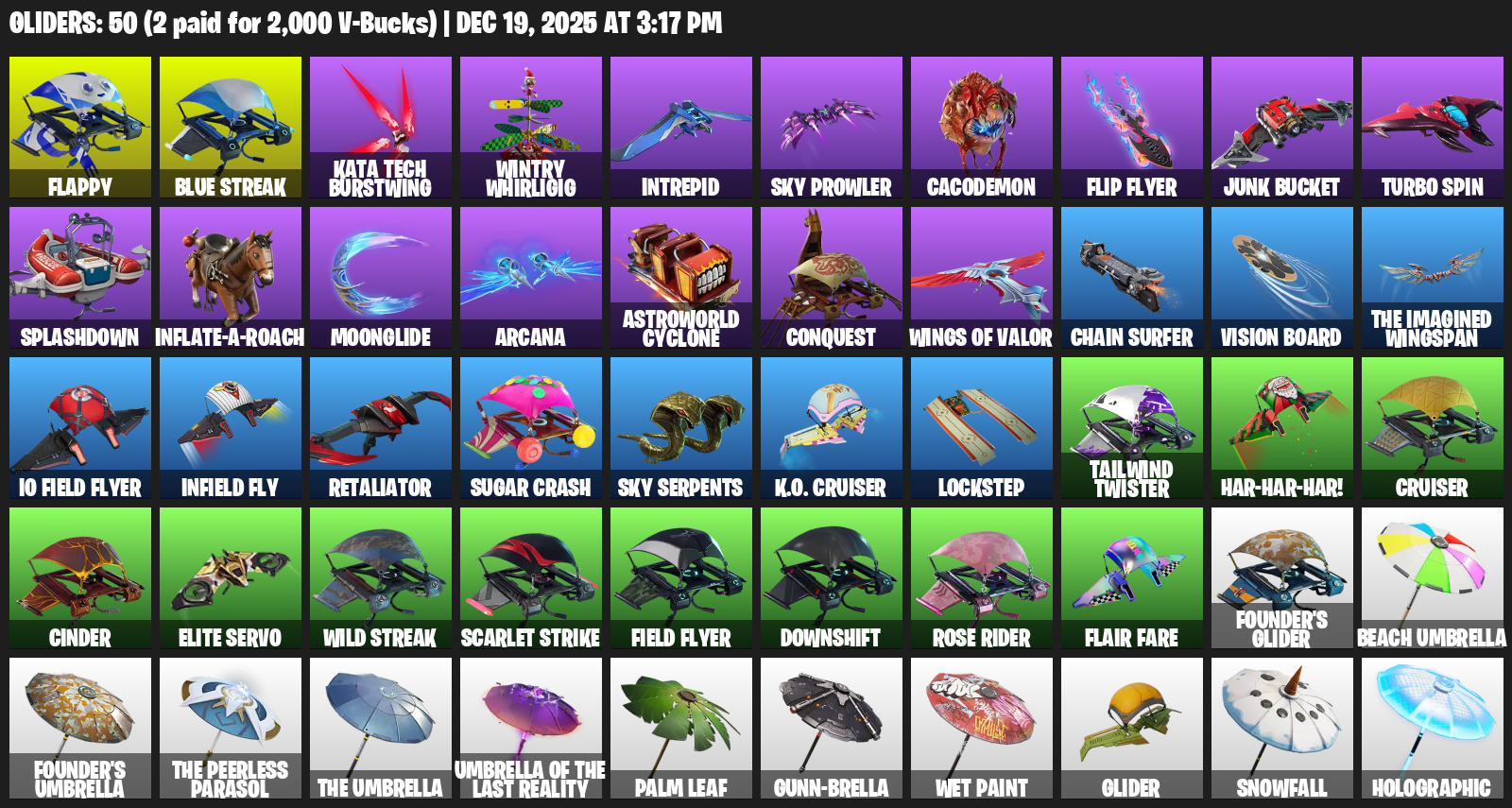 Flappy, Kata Tech Burstwing, Wintry Whirligig, Intrepid, Sky Prowler, Cacodemon, Flip Flyer, Junk Bucket, Turbo Spin, Splashdown, Inflate-A-Roach, Moonglide, Arcana, Astroworld Cyclone, Conquest, Chain Surfer