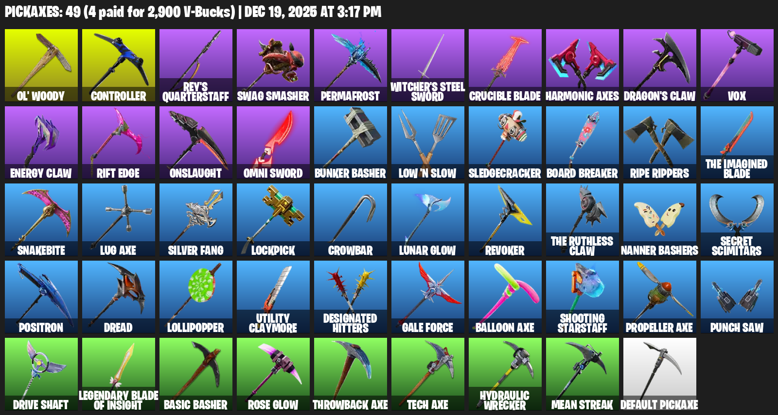 Ol’ Woody, Controller, Rey’s Quarterstaff, Swag Smasher, Permafrost, Witcher’s Steel Sword, Crucible Blade, Harmonic Axes, Dragon’s Claw, Vox, Rift Edge, Onslaught, Bunker Basher, Low ‘n Slow, Sledgecracker, Board Breaker, Ripe Rippers