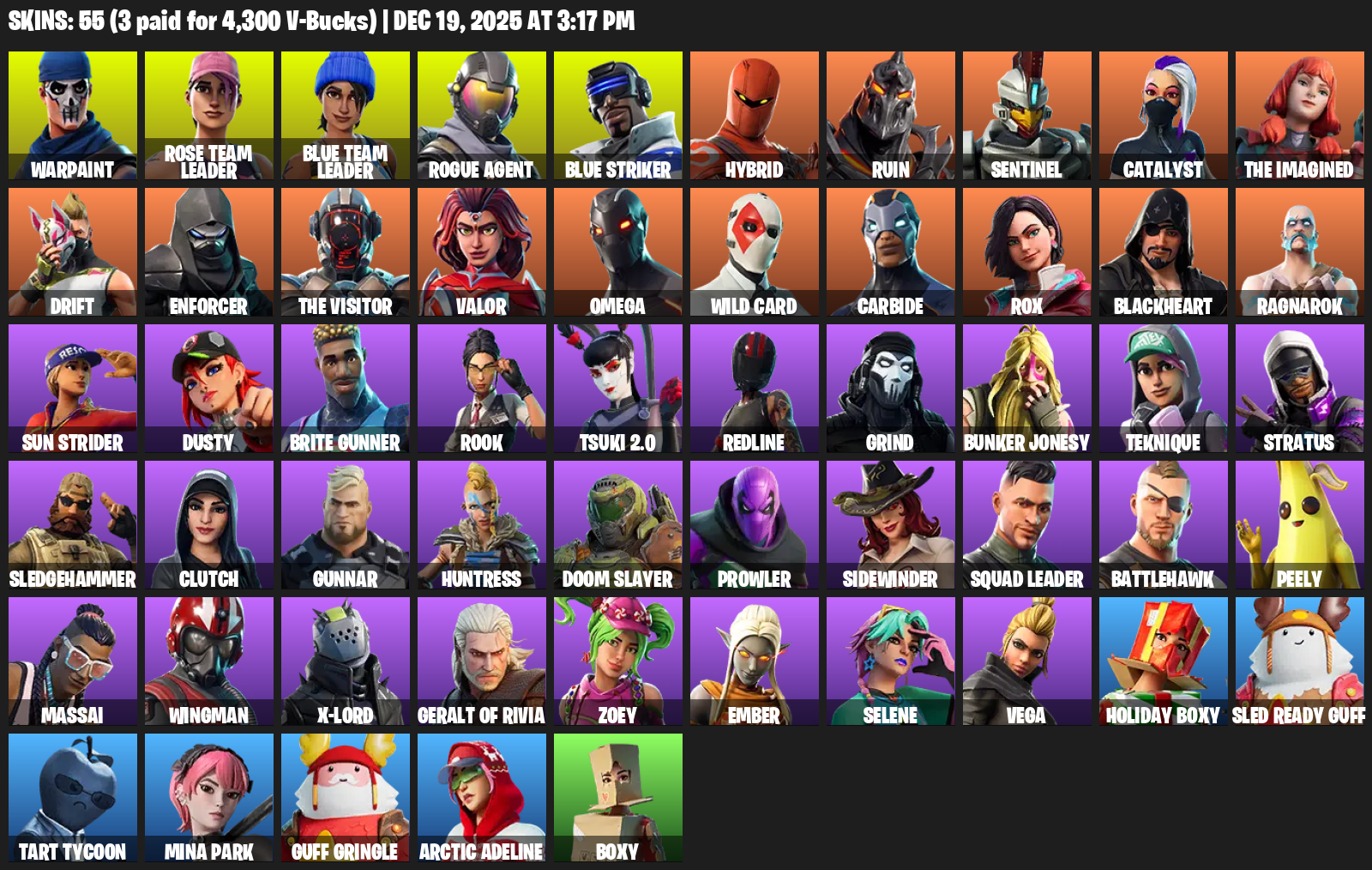 Omega, Warpaint, Rose Team Leader, Rogue Agent, Blue Striker, Hybrid, Ruin, Sentinel, Catalyst, The Imagined, Drift, Enforcer, Valor, Wild Card, Carbide, Rox, Blackheart, Ragnarok