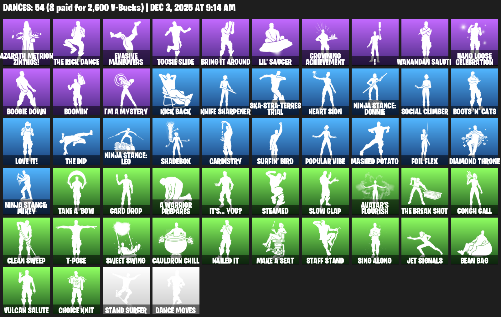 Azarath Metrion Zinthos!, Evasive Maneuvers, Toosie Slide, Bring it around, Lil’ Saucer, Crowning Achievement, !, Wakandan Salute, Hang Loose Celebration, Boogie Down, Boomin’, I’m a Mystery, Kick Back, Ska-stra-terrestrial, Heart Sign, Ninja Stance: Donnie, Social Climber, Boots ‘n’ Cats