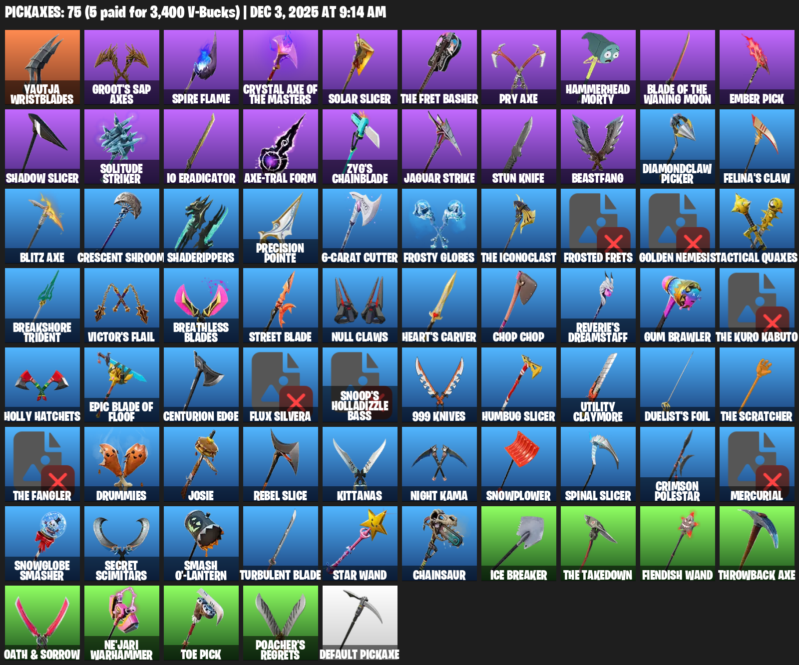 Yautja Wristblades, Groot’s Sap Axes, Crystal Axe of the Masters, Solar Slicer, Hammerhead Morty, Ember Pick, Solitude Striker, IO Eradicator, Zyg’s Chainblade, Jaguar Strike, Stun Knife, Beastfang, Diamondclaw Picker, Felina’s Claw