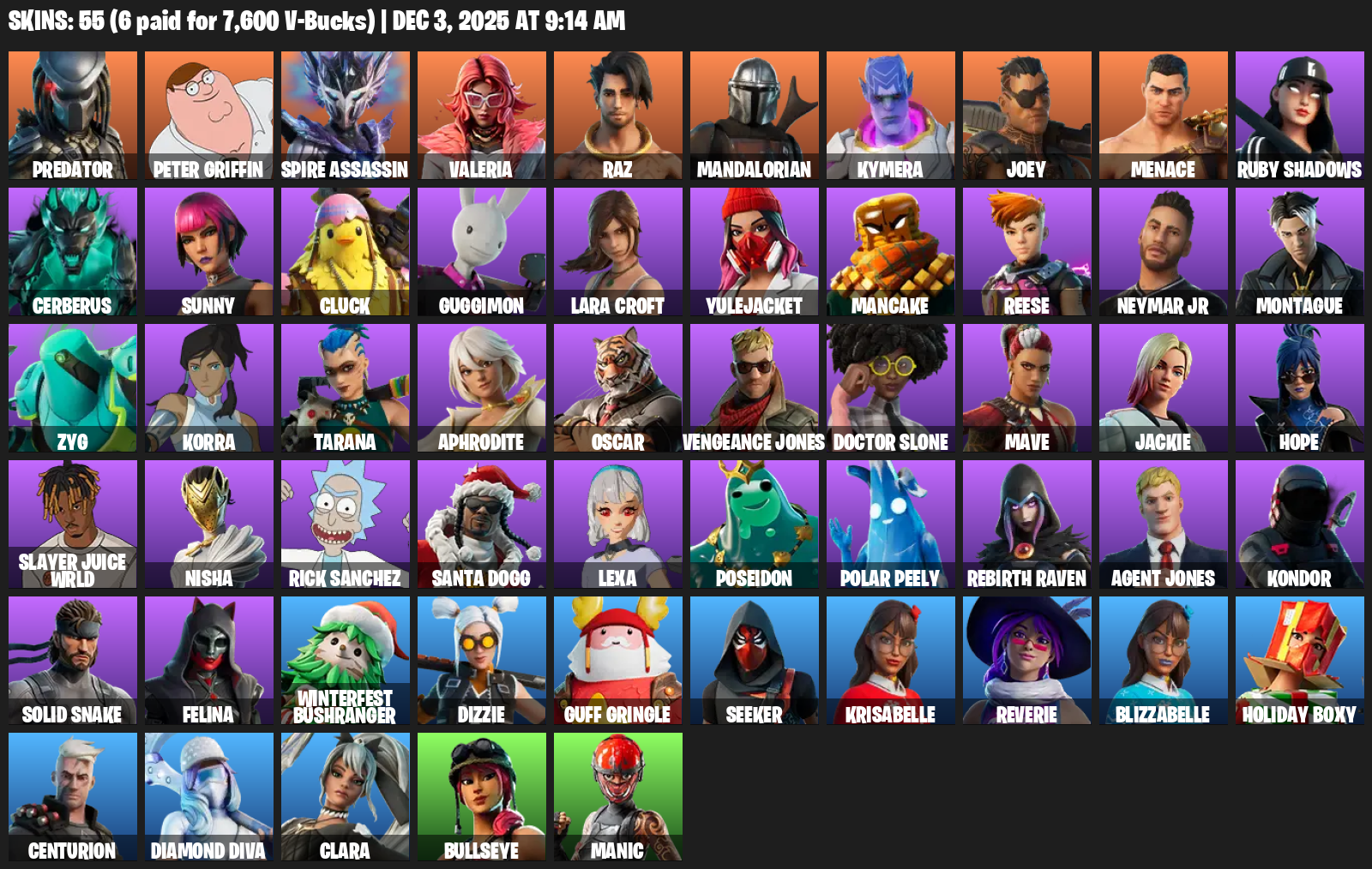 Lara Croft, Predator, Peter Griffin, Spire Assassin, Valeria, Raz, Mandalorian, Kymera, Joey, Menace, Ruby Shadows, Cerberus, Sunny, Cluck, Guggimon, Yulejacket, Mancake, Reese, Neymar Jr, Montague