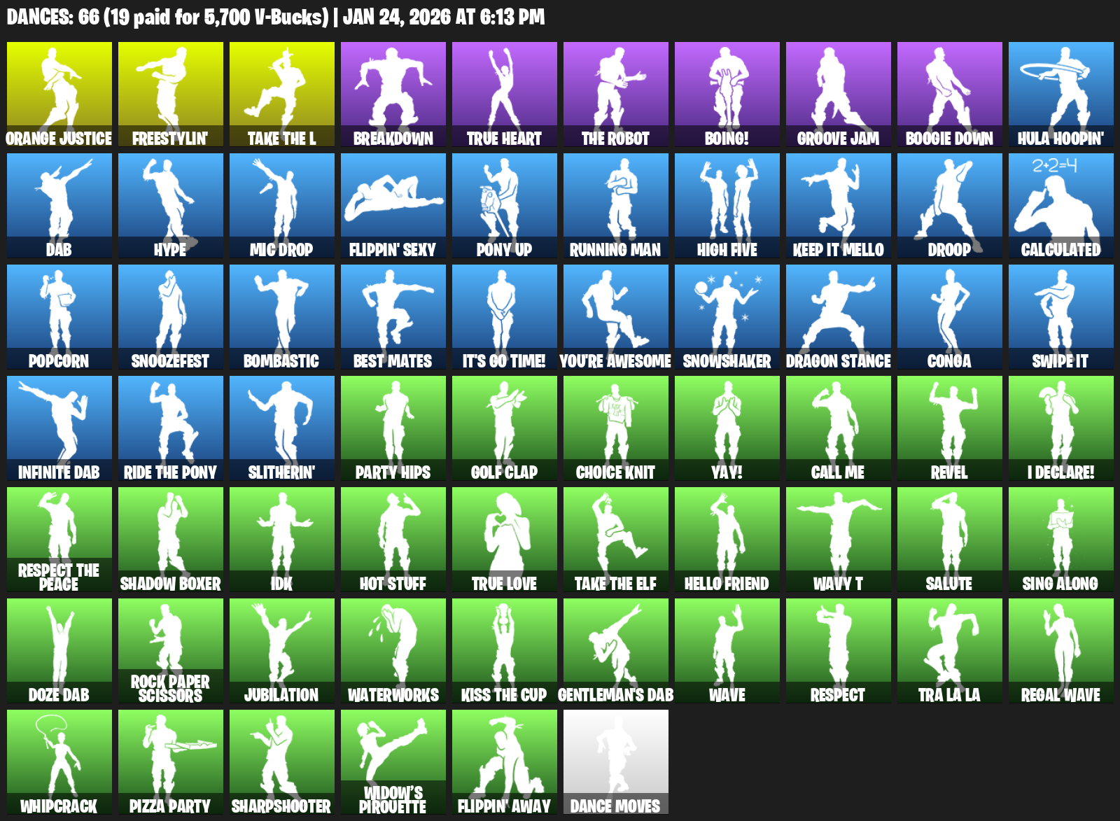 Orange Justice, Freestylin’, Breakdown, True Heart, Boing!, Groove Jam, Boogie Down, Hula Hoopin’, Dab, Hype, Mic Drop, Flippin’ Sexy, Running Man, High Five, Keep It Mello, Droop, Calculated