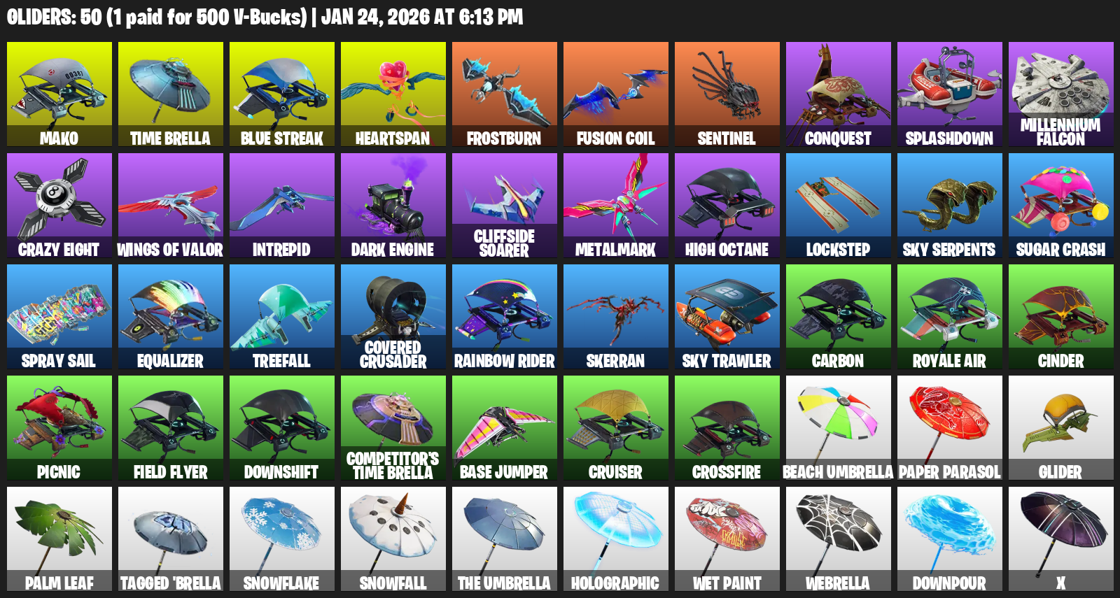 Mako, Time Brella, Heartspan, Frostburn, Sentinel, Conquest, Splashdown, Millennium Falcon, Crazy Eight, Intrepid, Cliffside Soarer, Metalmark, Lockstep, Sky Serpents, Sugar Crash