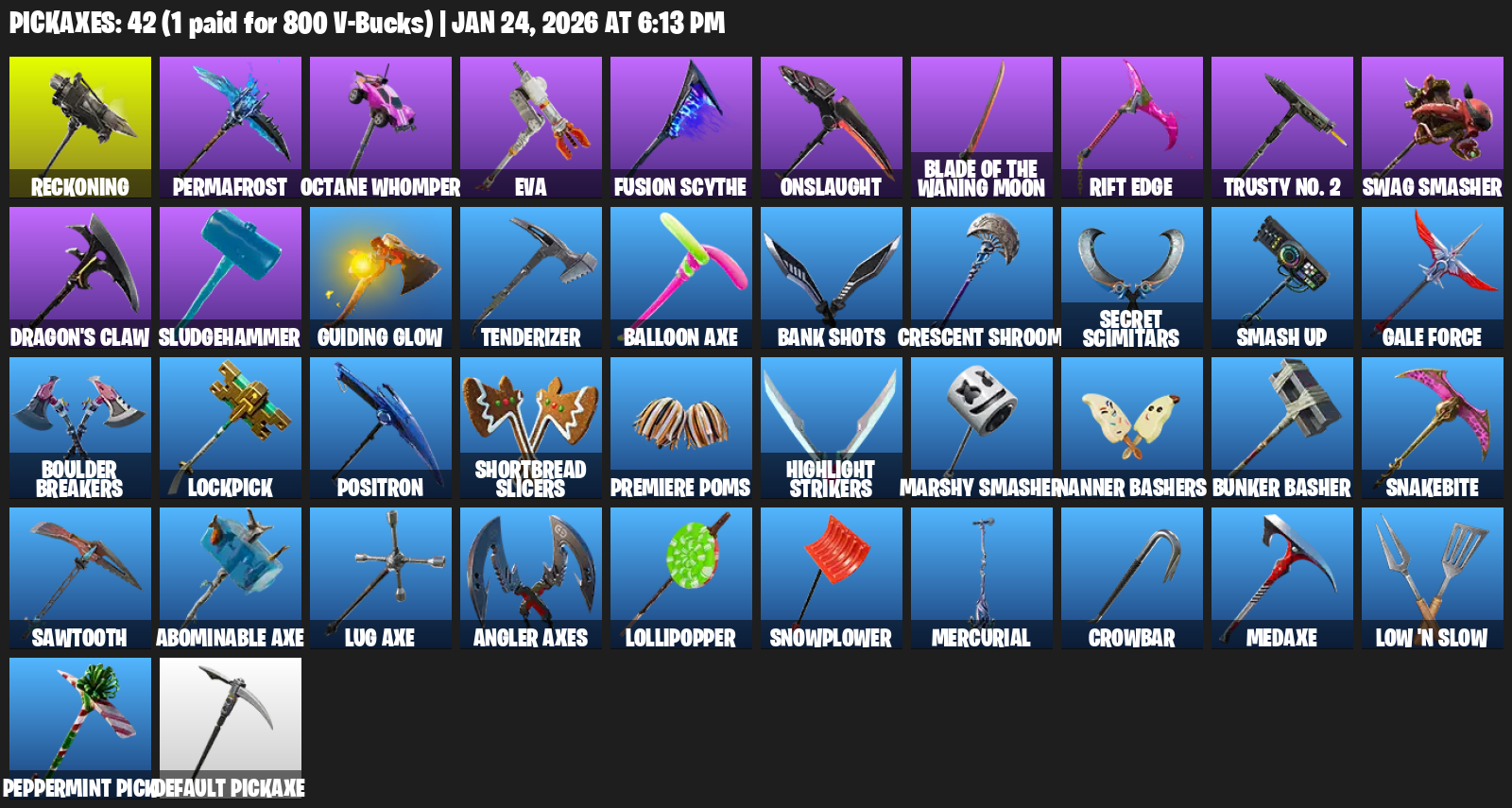 Reckoning, Permafrost, Octane Whomper, EVA, Onslaught, Rift Edge, Trusty No. 2, Swag Smasher, Dragon’s Claw, Sludgehammer, Guiding Glow, Tenderizer, Balloon Axe, Bank Shots, Crescent Shroom, Secret Scimitars, Smash Up, Gale Force