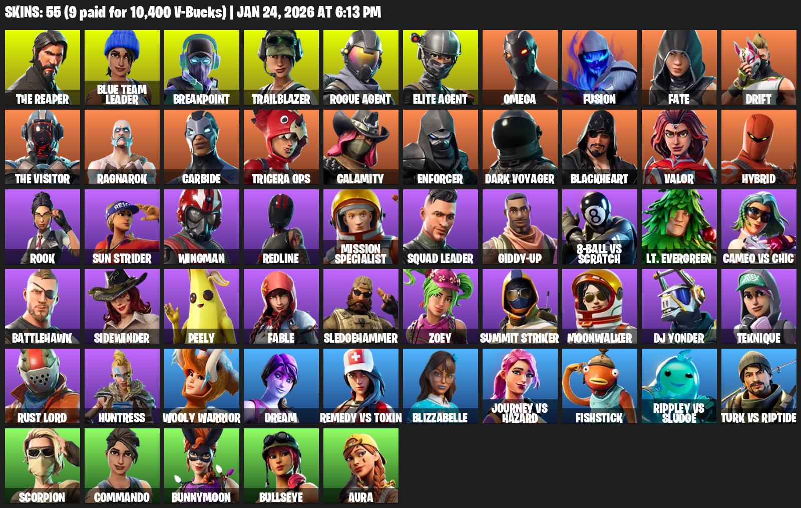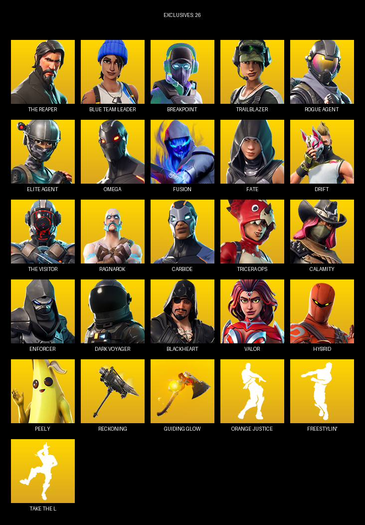 The Reaper, Elite Agent, Omega, Blue Team Leader, Breakpoint, Trailblazer, Fusion, Fate, Drift, Ragnarok, Carbide, Tricera Ops, Calamity, Enforcer, Dark Voyager, Blackheart, Valor, Hybrid