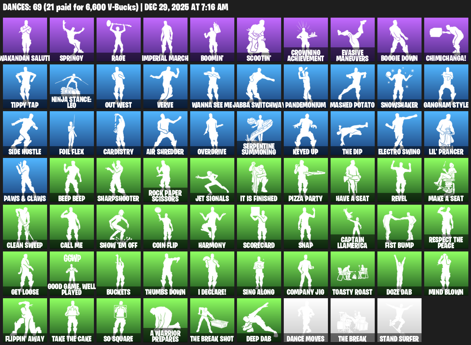 Wakandan Salute, Springy, Rage, Imperial March, Boomin’, Scootin’, Crowning Achievement, Evasive Maneuvers, Boogie Down, Chimichanga!, Tippy Tap, Ninja Stance: Leo, Out West, Verve, Wanna See Me, Jabba Switchway, Pandemonium, Mashed Potato, Snowshaker, Gangnam Style