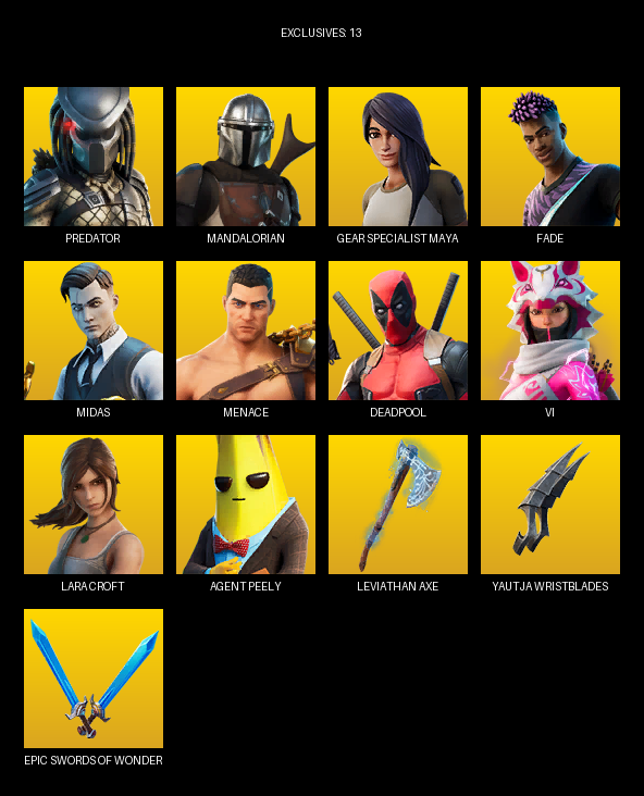 Gear Specialist Maya, Lara Croft, Predator, Mandalorian, Fade, Midas, Menace, Deadpool, Vi, Kit, TNTina, Mystique, Lexa, Doctor Doom, Tony Stark, Llambro, Yulejacket, Thor, Brutus, Agent Jones