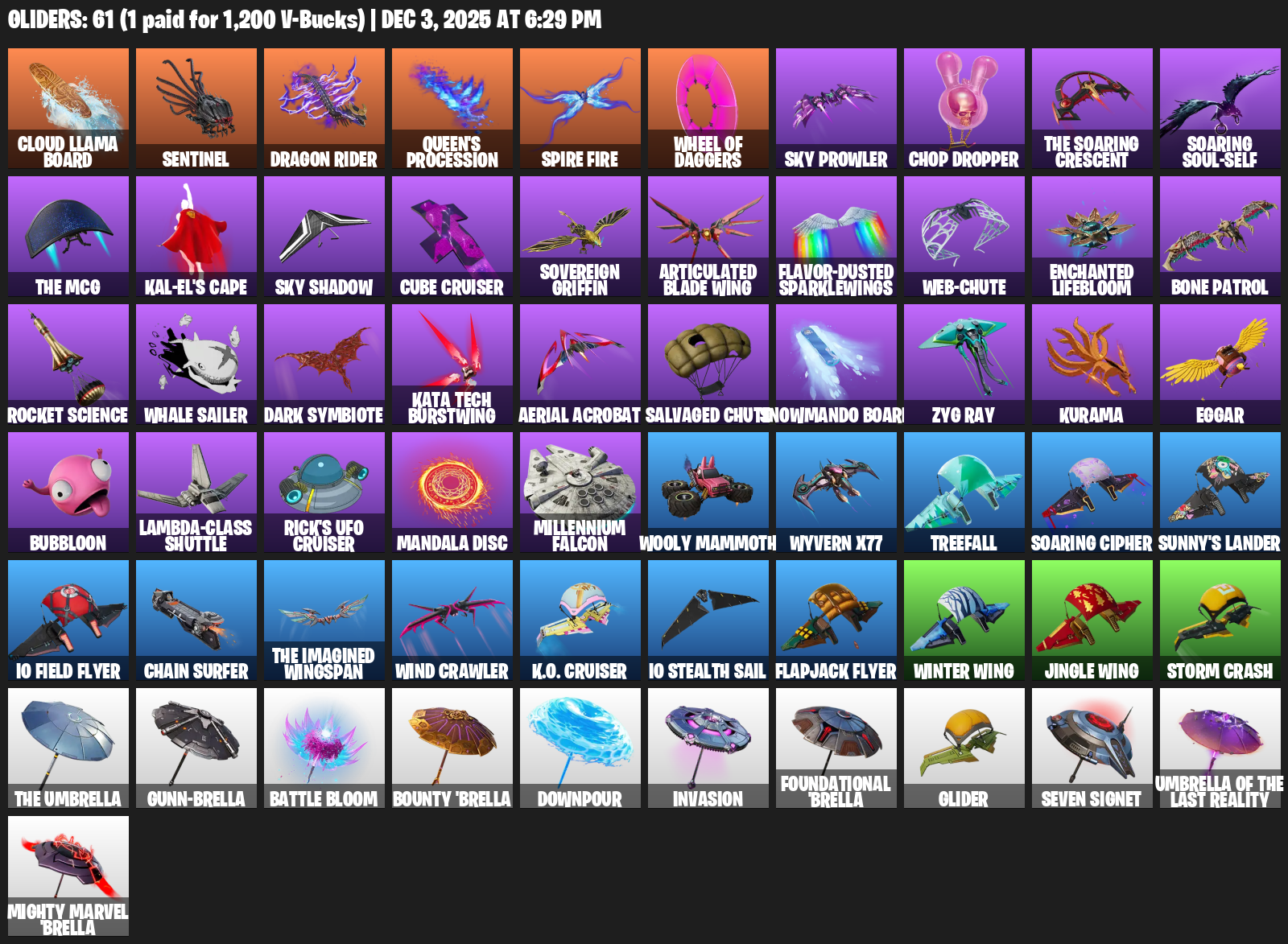 Cloud Llama Board, Sentinel, Queen’s Procession, Chop Dropper, Soaring Soul-Self, Kal-El’s Cape, Sky Shadow, Sovereign Griffin, Articulated Blade Wing, Flavor-Dusted Sparklewings, Enchanted Lifebloom, Bone Patrol
