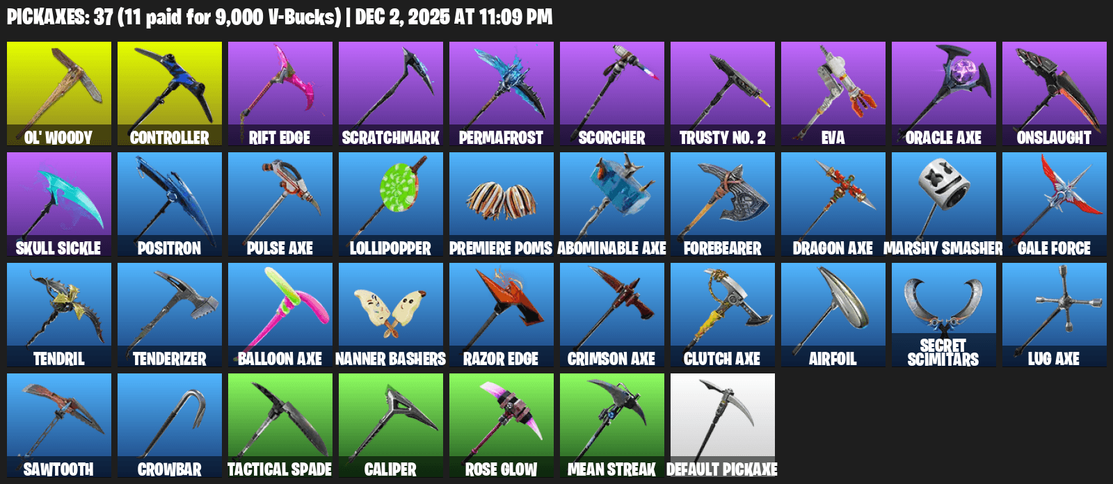 Ol’ Woody, Controller, Rift Edge, Scratchmark, Permafrost, Scorcher, Trusty No. 2, EVA, Oracle Axe, Onslaught, Skull Sickle, Positron, Lollipopper, Premiere Poms, Forebearer, Marshy Smasher, Gale Force