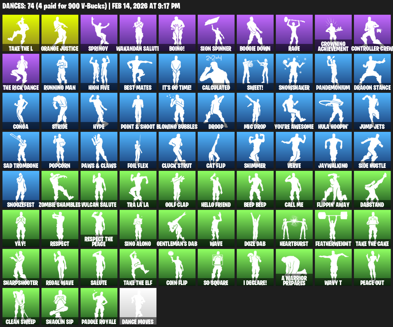 Take The L, Orange Justice, Springy , Wakandan Salute, Boing!, Sign Spinner, Boogie Down, Rage, Crowning Achievement, Controller Crew, Running Man, High Five, Best Mates, It’s Go Time!, Calculated, Sweet!, Snowshaker, Pandemonium, Dragon Stance