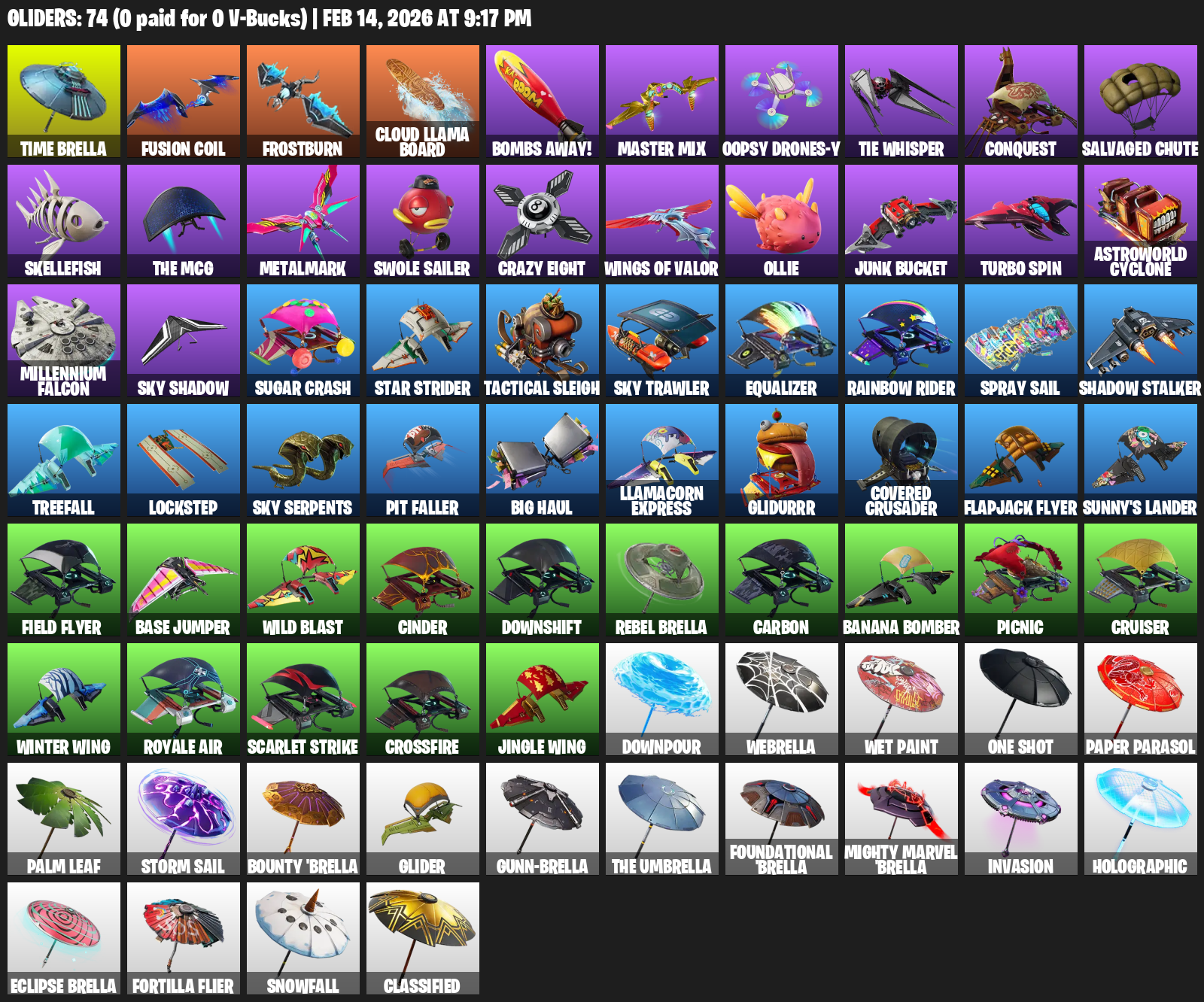 Time Brella, Frostburn, Cloud Llama Board, Bombs Away!, Master Mix, Oopsy Drones-y, TIE Whisper, Conquest, Salvaged Chute, Skellefish, Metalmark, Swole Sailer, Crazy Eight, Ollie, Junk Bucket, Turbo Spin, Astroworld Cyclone
