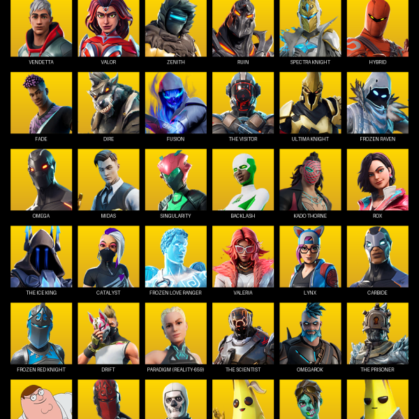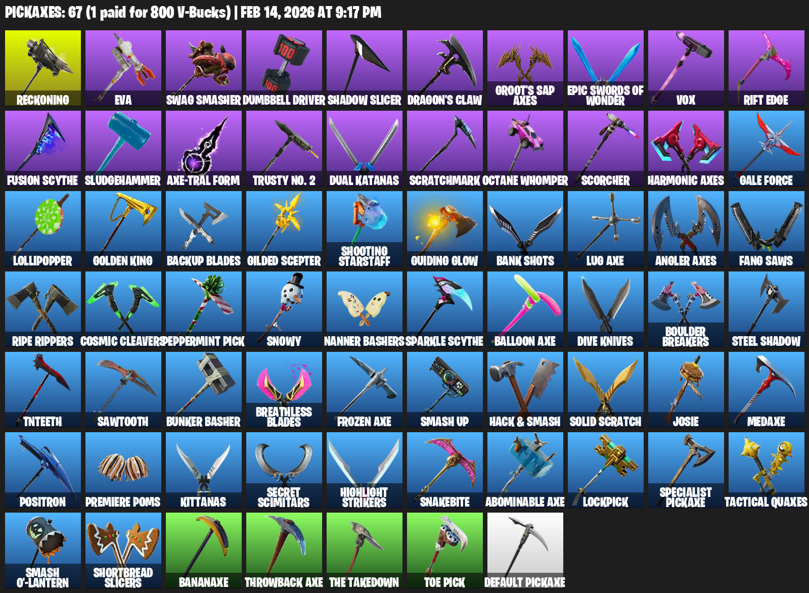 Reckoning, EVA, Swag Smasher, Dumbbell Driver, Shadow Slicer, Dragon’s Claw, Groot’s Sap Axes, Vox, Rift Edge, Sludgehammer, Axe-tral Form, Trusty No. 2, Dual Katanas, Scratchmark, Octane Whomper, Scorcher, Gale Force