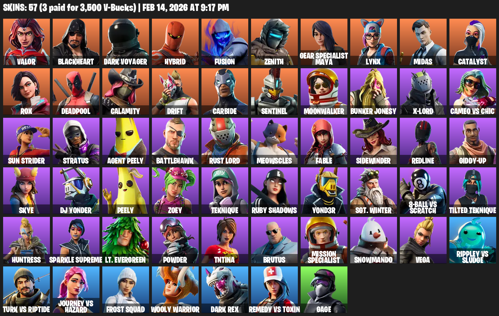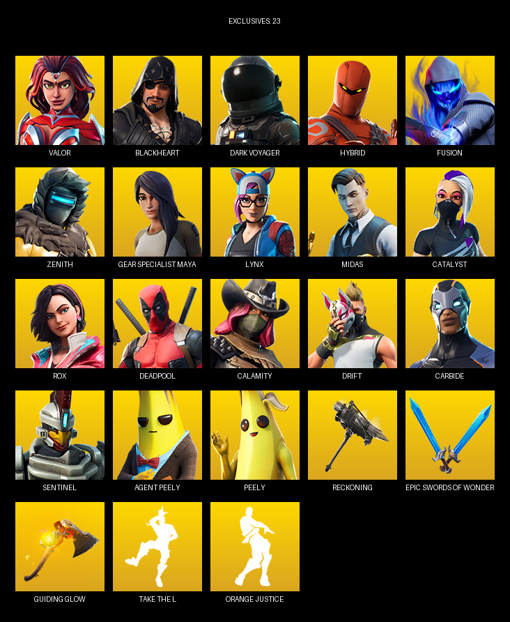 Gear Specialist Maya, Valor, Blackheart, Dark Voyager, Hybrid, Fusion, Zenith, Lynx, Midas, Catalyst, Rox, Deadpool, Calamity, Drift, Carbide, Sentinel, Moonwalker, Bunker Jonesy, X-Lord, Cameo vs Chic