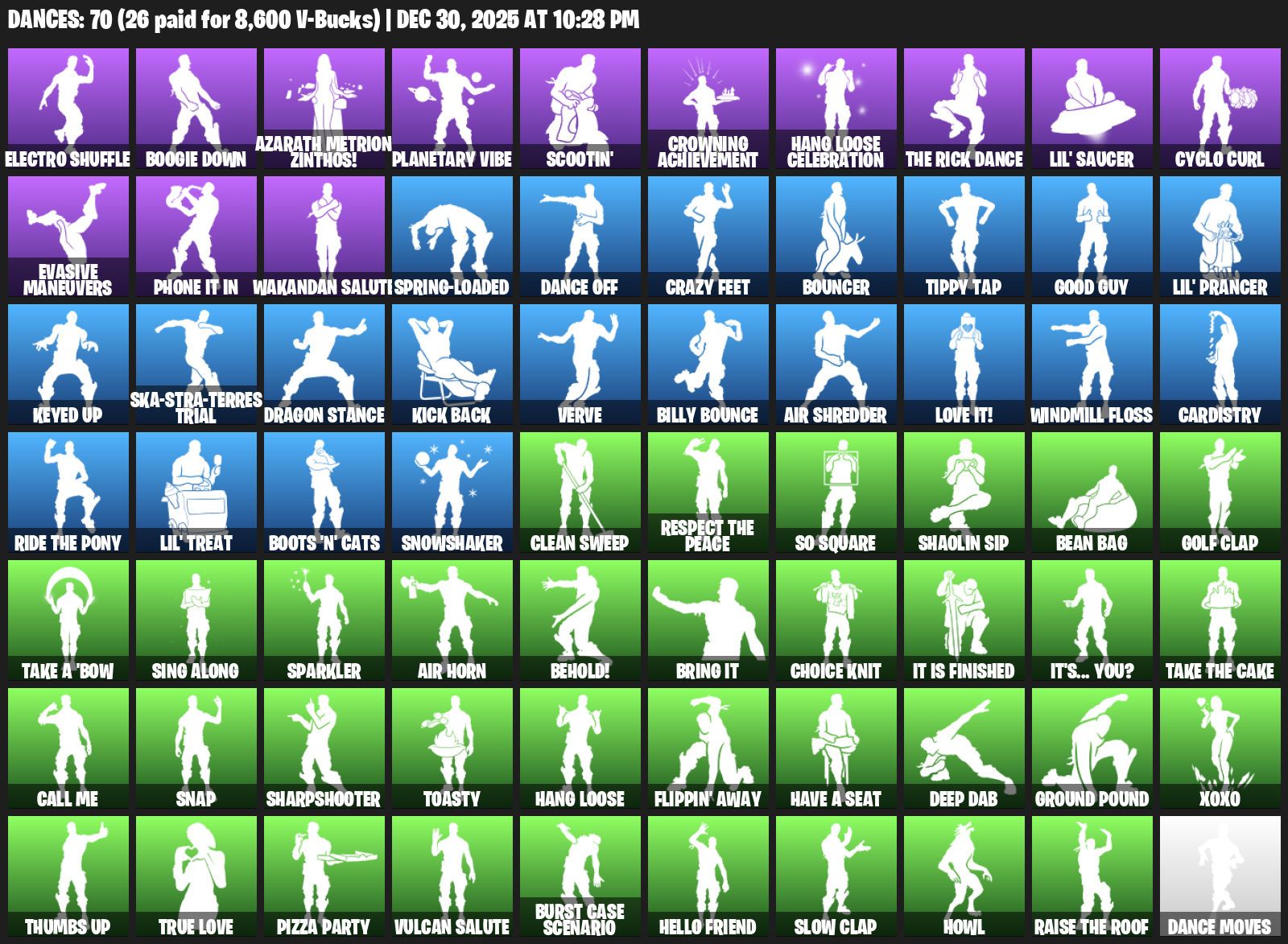 Electro Shuffle, Boogie Down, Azarath Metrion Zinthos!, Planetary Vibe, Scootin’, Crowning Achievement, Hang Loose Celebration, Lil’ Saucer, Cyclo Curl, Evasive Maneuvers, Phone It In, Wakandan Salute, Spring-Loaded, Dance Off, Crazy Feet, Bouncer, Tippy Tap, Good Guy
