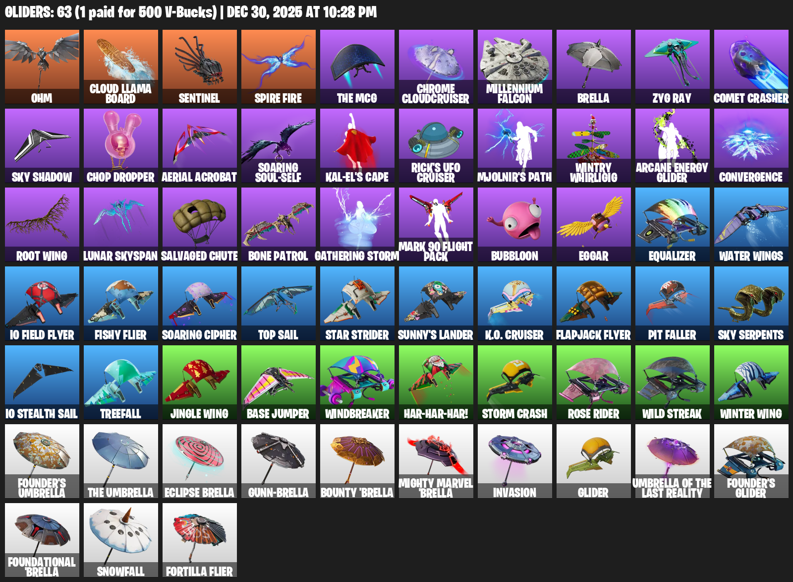 Ohm, Cloud Llama Board, Sentinel, Chrome Cloudcruiser, Millennium Falcon, Brella, Zyg Ray, Comet Crasher, Sky Shadow, Chop Dropper, Aerial Acrobat, Soaring Soul-Self, Kal-El’s Cape, Rick’s UFO Cruiser, Mjolnir’s Path, Wintry Whirligig, Arcane Energy Glider, Convergence