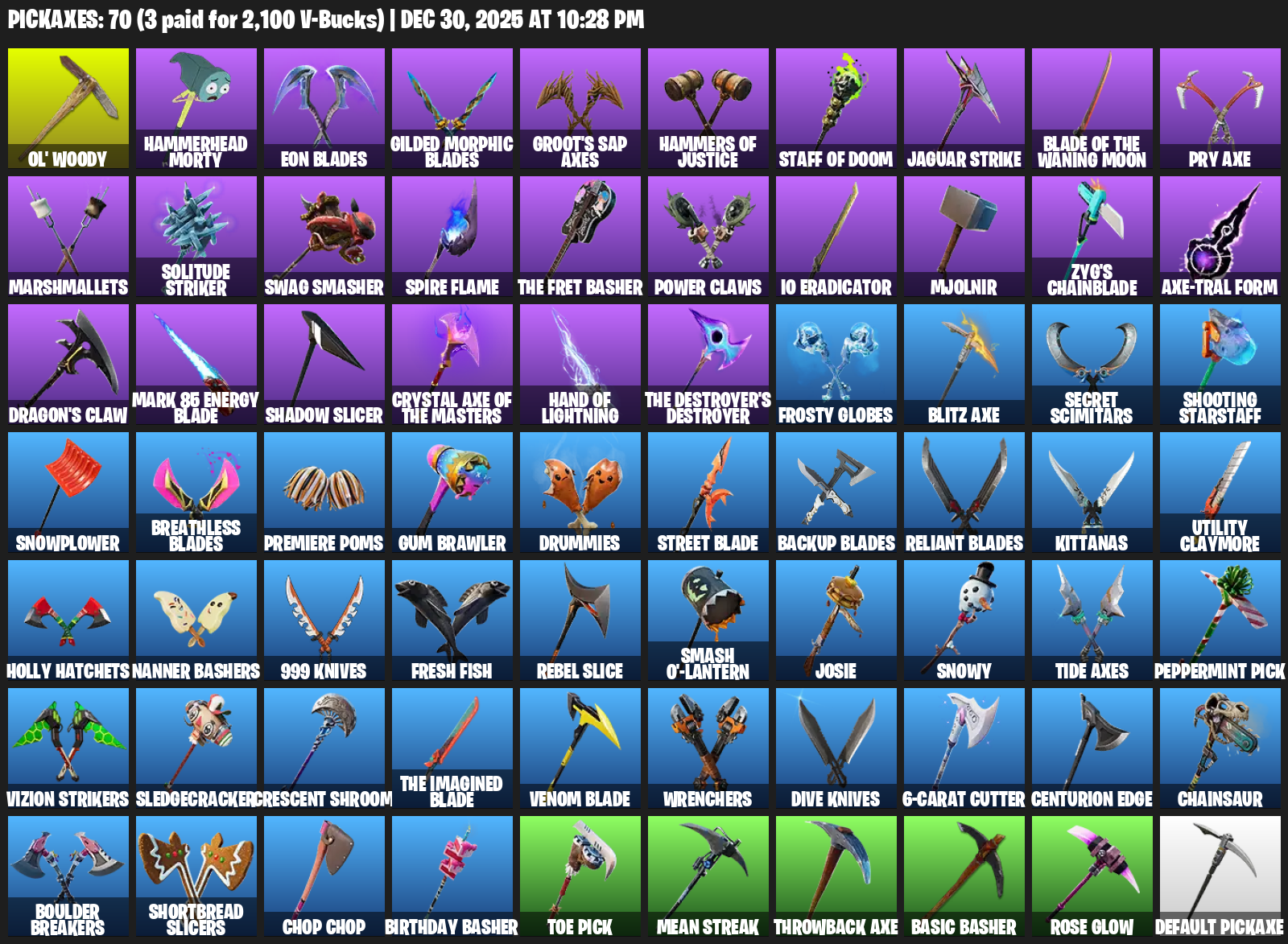 Ol’ Woody, Hammerhead Morty, Eon Blades, Groot’s Sap Axes, Hammers of Justice, Jaguar Strike, Pry Axe, Marshmallets, Swag Smasher, The Fret Basher, Power Claws, IO Eradicator, Mjolnir, Zyg’s Chainblade