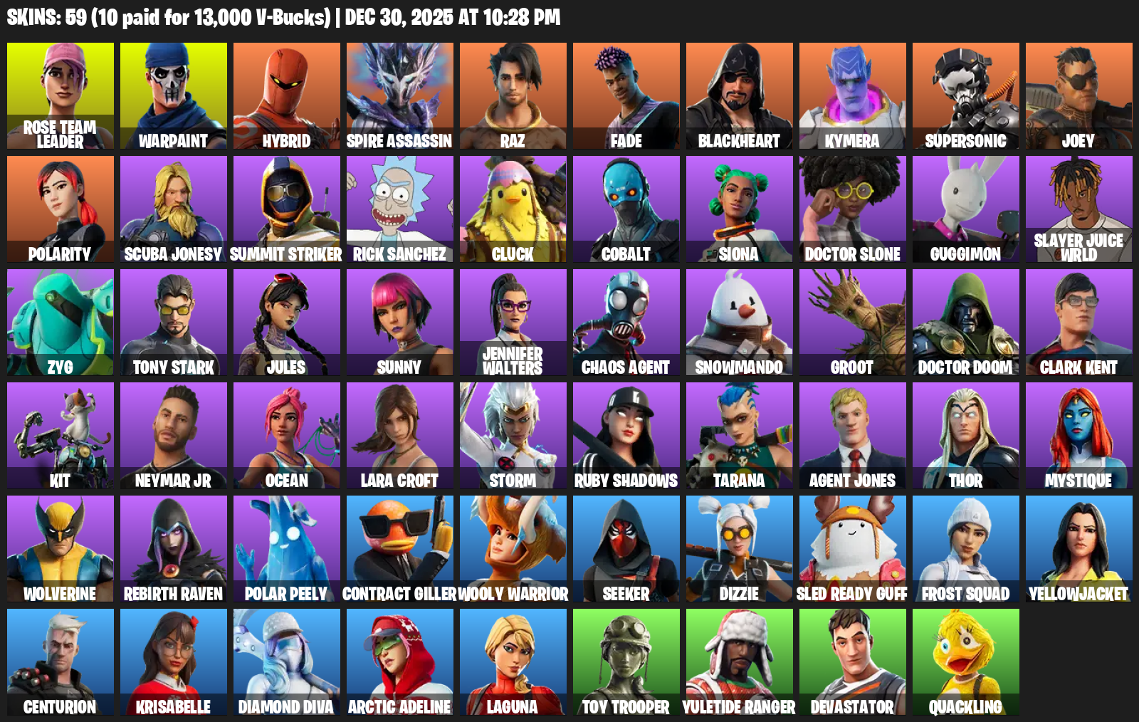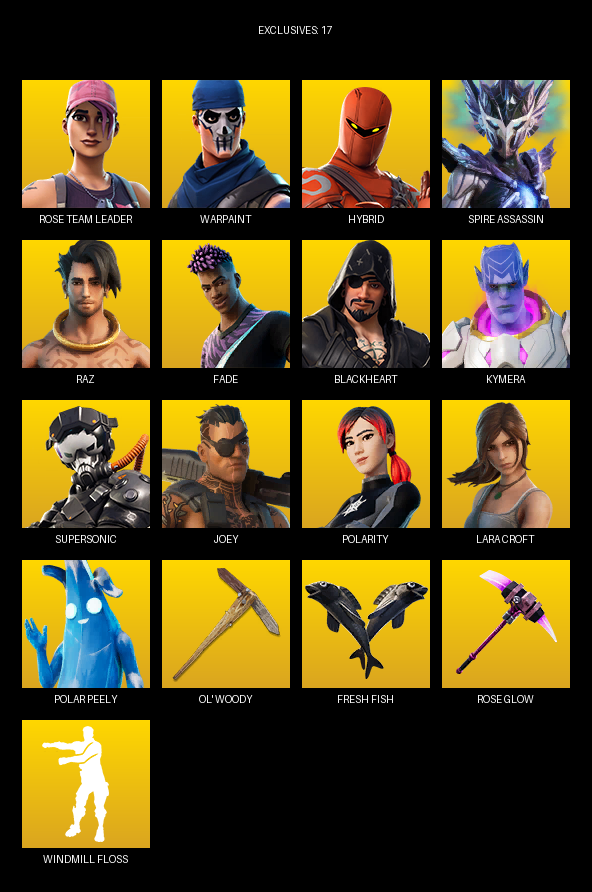 Lara Croft, Rose Team Leader, Warpaint, Hybrid, Spire Assassin, Raz, Fade, Blackheart, Kymera, Supersonic, Joey, Polarity, Scuba Jonesy, Summit Striker, Rick Sanchez, Cluck, Cobalt, Siona, Doctor Slone, Guggimon
