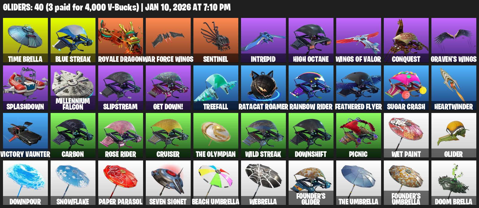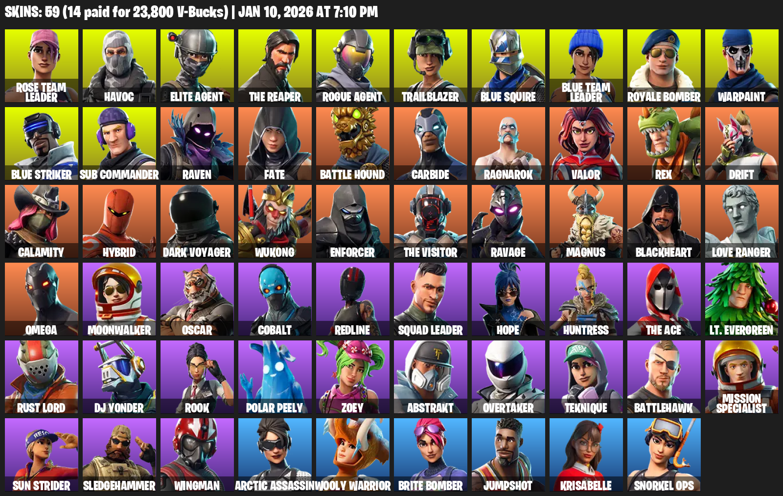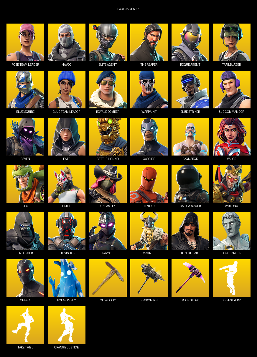 Elite Agent, The Reaper, Blue Squire, Omega, Rose Team Leader, Havoc, Trailblazer, Royale Bomber, Warpaint, Sub Commander, Raven, Fate, Battle Hound, Carbide, Ragnarok, Valor, Rex