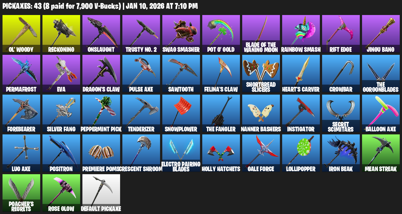 Ol’ Woody, Reckoning, Onslaught, Trusty No. 2, Swag Smasher, Pot O’ Gold, Rainbow Smash, Rift Edge, Jingu Bang, Permafrost, EVA, Dragon’s Claw, Pulse Axe, Sawtooth, Shortbread Slicers, Heart’s Carver, Crowbar
