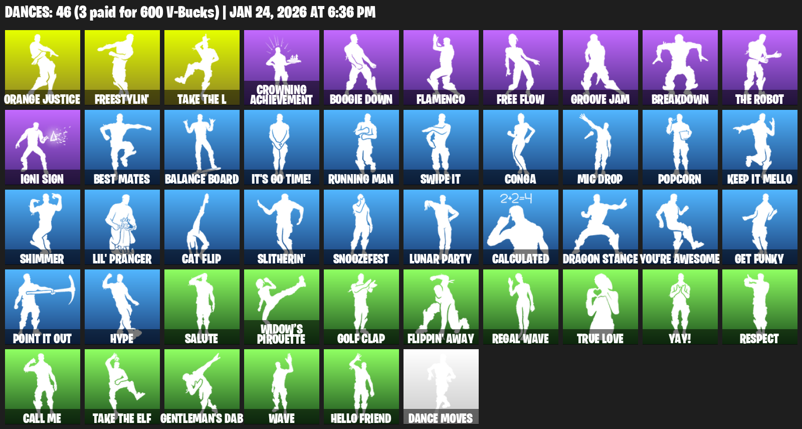 Orange Justice, Freestylin’, Crowning Achievement, Boogie Down, Flamenco, Free Flow, Groove Jam, Breakdown, Igni Sign, Best Mates, Balance Board, It’s Go Time!, Running Man, Swipe It, Conga, Mic Drop, Popcorn