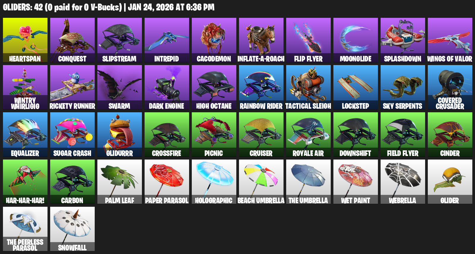 Heartspan, Conquest, Slipstream, Intrepid, Cacodemon, Inflate-A-Roach, Flip Flyer, Moonglide, Splashdown, Wings of Valor, Wintry Whirligig, Rickety Runner, Swarm, High Octane, Rainbow Rider, Tactical Sleigh, Lockstep, Sky Serpents, Covered Crusader