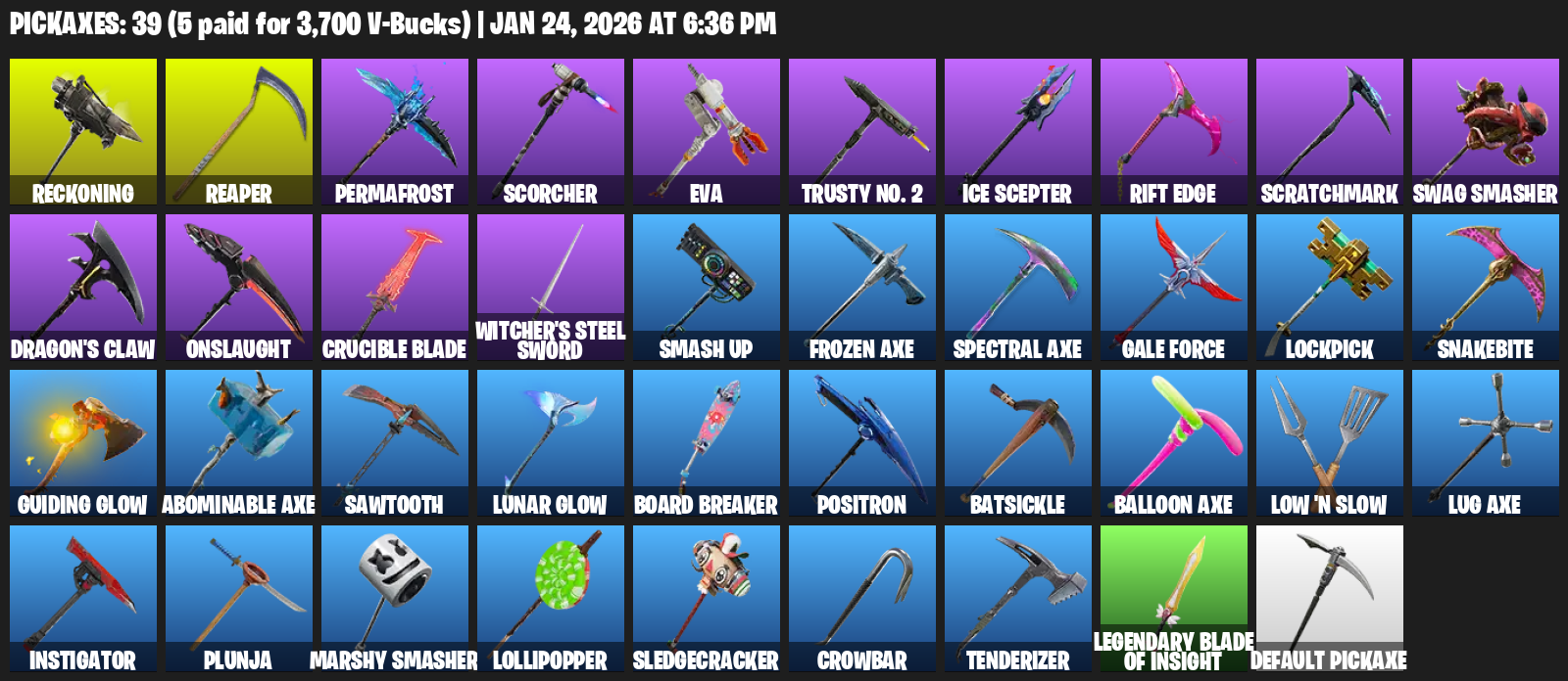 Reckoning, Permafrost, Scorcher, EVA, Trusty No. 2, Ice Scepter, Rift Edge, Scratchmark, Swag Smasher, Dragon’s Claw, Onslaught, Crucible Blade, Witcher’s Steel Sword, Smash Up, Frozen Axe, Gale Force, Lockpick, Snakebite