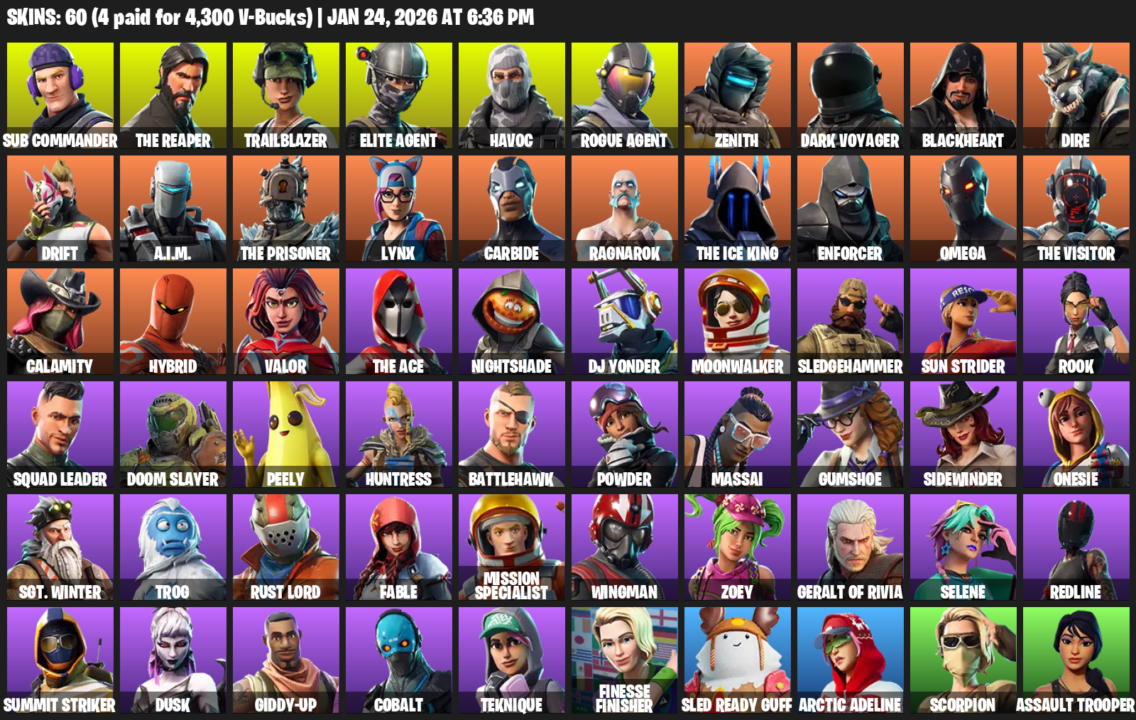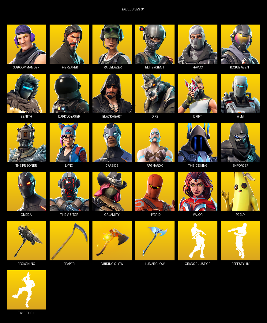 The Reaper, Elite Agent, Omega, Sub Commander, Trailblazer, Havoc, Zenith, Dark Voyager, Blackheart, Dire, Drift, A.I.M., Lynx, Carbide, Ragnarok, Enforcer