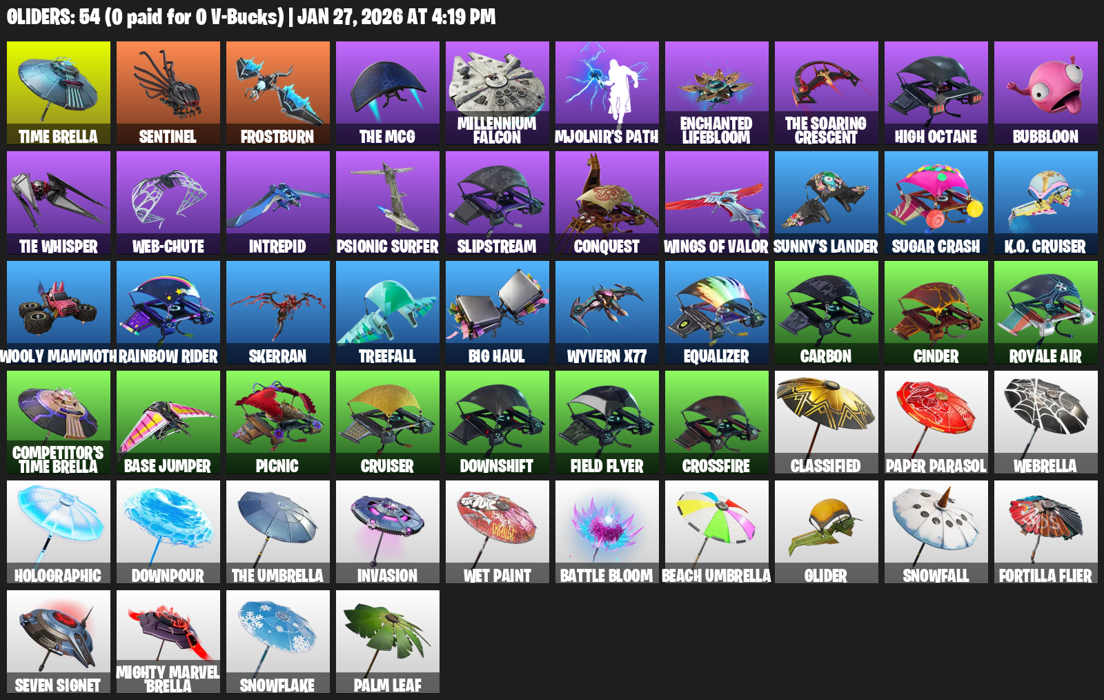 Time Brella, Sentinel, Frostburn, Millennium Falcon, Mjolnir’s Path, Enchanted Lifebloom, High Octane, Bubbloon, TIE Whisper, Intrepid, Psionic Surfer, Slipstream, Conquest, Sunny’s Lander, Sugar Crash, K.O. Cruiser