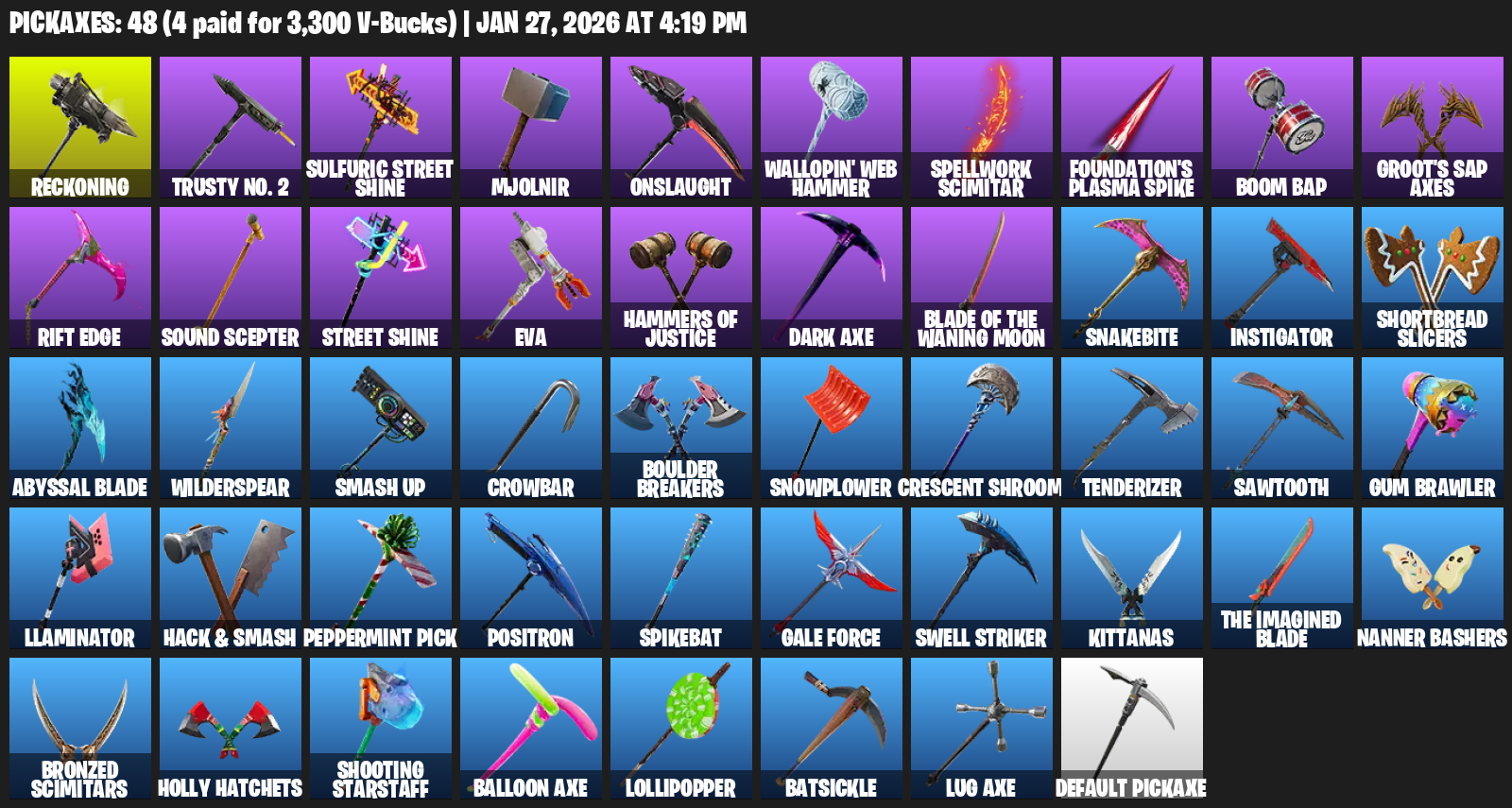 Reckoning, Trusty No. 2, Sulfuric Street Shine, Mjolnir, Onslaught, Wallopin’ Web Hammer, Spellwork Scimitar, Foundation’s Plasma Spike, Boom Bap, Groot’s Sap Axes, Rift Edge, Sound Scepter, EVA, Hammers of Justice, Snakebite, Instigator, Shortbread Slicers