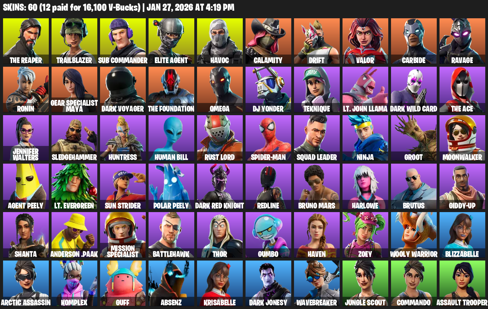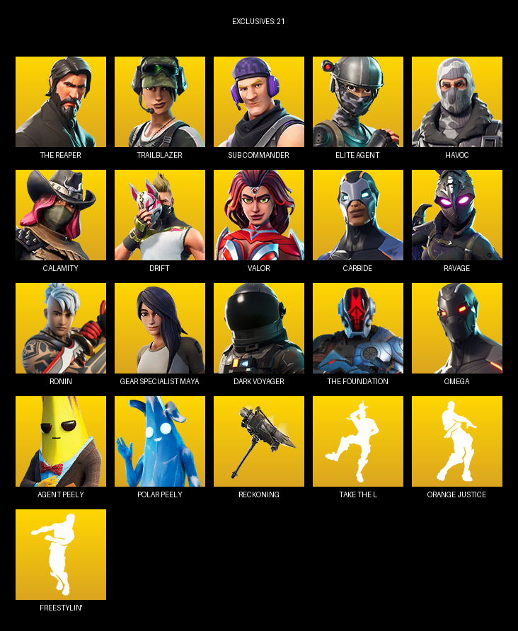 The Reaper, Elite Agent, Gear Specialist Maya, Omega, Trailblazer, Sub Commander, Havoc, Calamity, Drift, Valor, Carbide, Ravage, Ronin, Dark Voyager, DJ Yonder, Teknique, Lt. John Llama