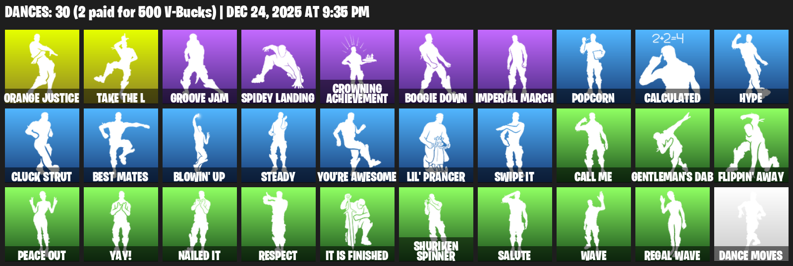 Orange Justice, Groove Jam, Spidey Landing, Crowning Achievement, Boogie Down, Imperial March, Popcorn, Calculated, Hype, Cluck Strut, Best Mates, Blowin’ Up, Steady, You’re Awesome, Lil’ Prancer, Swipe It, Call me, Gentleman’s Dab, Flippin’ Away