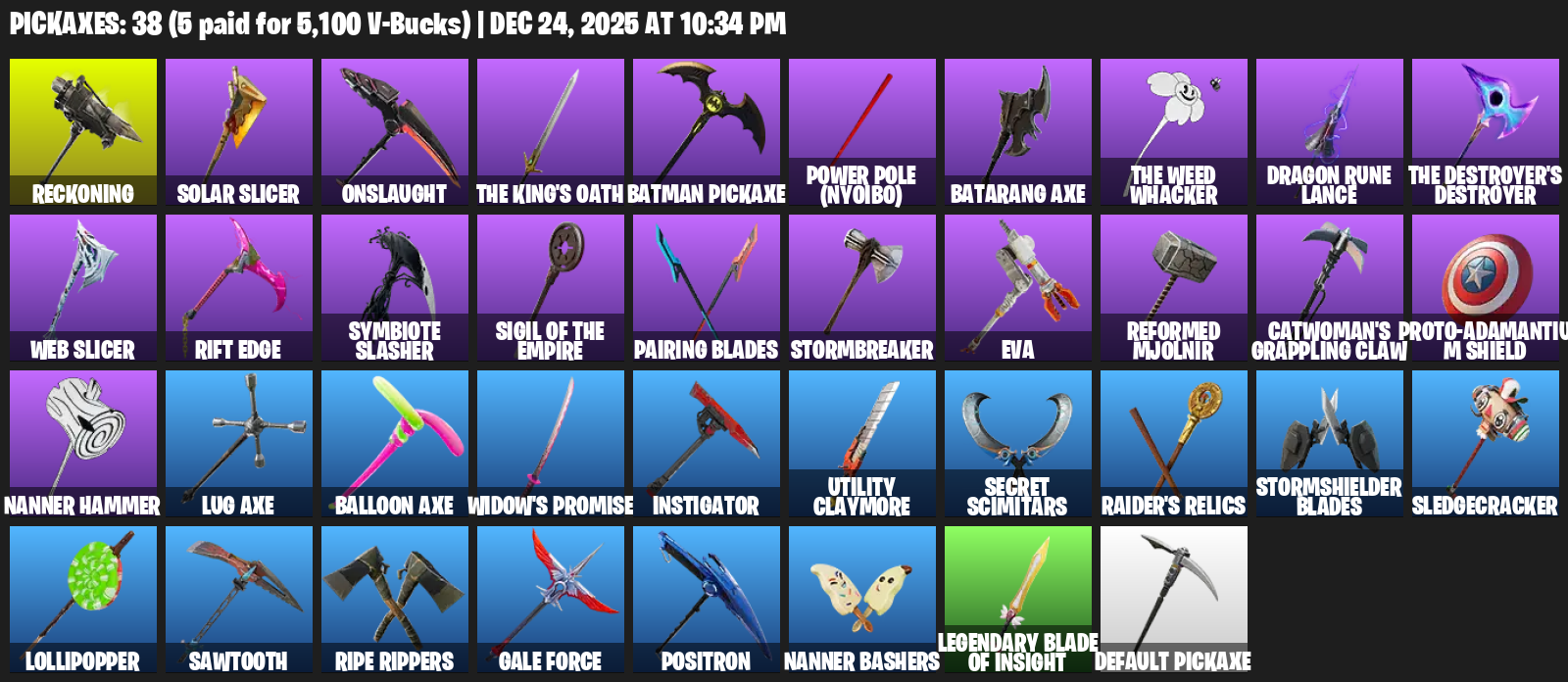 Reckoning, Solar Slicer, Onslaught, Batman Pickaxe, Power Pole (Nyoibo), Batarang Axe, Dragon Rune Lance, Rift Edge, Symbiote Slasher, Pairing Blades, Stormbreaker, EVA, Reformed Mjolnir, Catwoman’s Grappling Claw, Proto-Adamantium Shield
