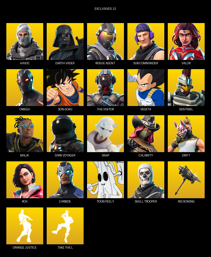 Omega, Havoc, Darth Vader, Rogue Agent, Sub Commander, Valor, Son Goku, The Visitor, Vegeta, Sentinel, Malik, Dark Voyager, Snap, Calamity, Drift, Rox, Carbide, Toon Peely, Thor Odinson