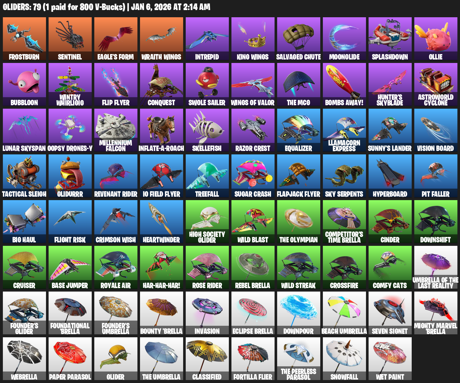 Frostburn, Sentinel, Wraith Wings, Intrepid, Salvaged Chute, Moonglide, Splashdown, Ollie, Bubbloon, Wintry Whirligig, Flip Flyer, Conquest, Swole Sailer, Bombs Away!, Hunter’s Skyblade, Astroworld Cyclone